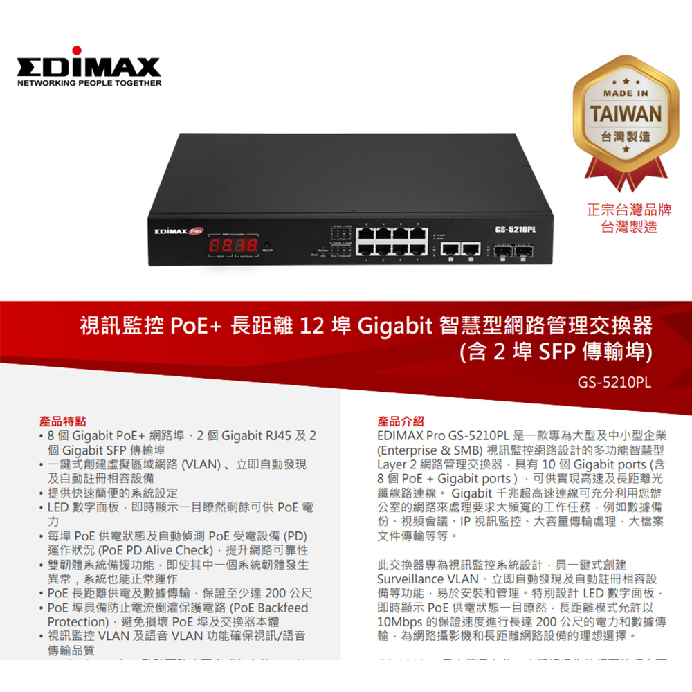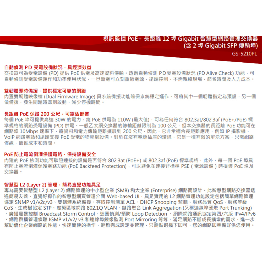 -8個Gigabit PoE+網路埠、2個Gigabit RJ45及2個Gigabit SFP傳輸埠。