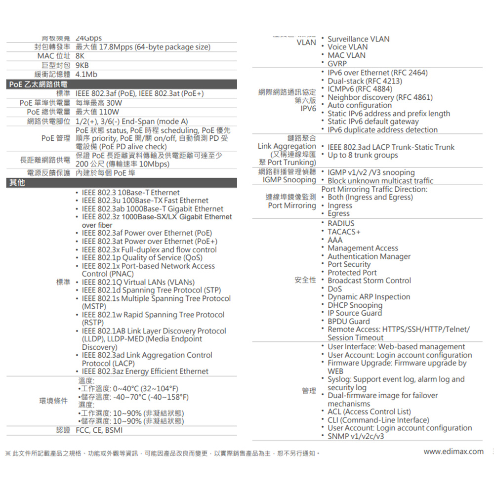 -支援背板頻寬24Gbps,封包轉發率17.8Mpps,MAC位址8K及巨型封包 (Jumbo Frame) 9KB。