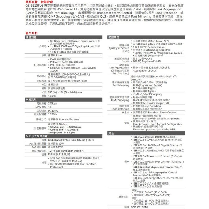 • 8 個 Gigabit PoE+ 網路埠及 2 個 Uplink 傳輸埠 (1個 Gigabit RJ45 埠及 1 個 SFP 光纖埠)。• PoE+ 埠符合 IEEE 802.3af/at 標準,可簡化部署和安裝。• PoE+ 埠最高每埠可提供 30W 給 PoE PD 受電設備,總輸出功率高達 100W。• PoE 長距離供電及數據傳輸,保證距離至少達 200公尺。• 自動偵測 PoE 受電設備 (PD) 和功率使用狀況。• 每一 PoE 埠具備防止電流倒灌保護電路 (PoEBackfeed Protection),避免損壞 PoE 埠及交換器本體。• 支援背板頻寬 20Gbps,封包轉發率 14.88Mpps,MAC 位址 4K 及巨型封包 (Jumbo Frame) 9KB。• 智慧網路管理支援 QoS, 802.1Q VLAN, PortTrunking, Port Mirroring, IGMP Snoopingv1/v2/v3 及 Broadcast Storm Control 等等。• 可機架式安裝設計 (包含機架安裝配件)。