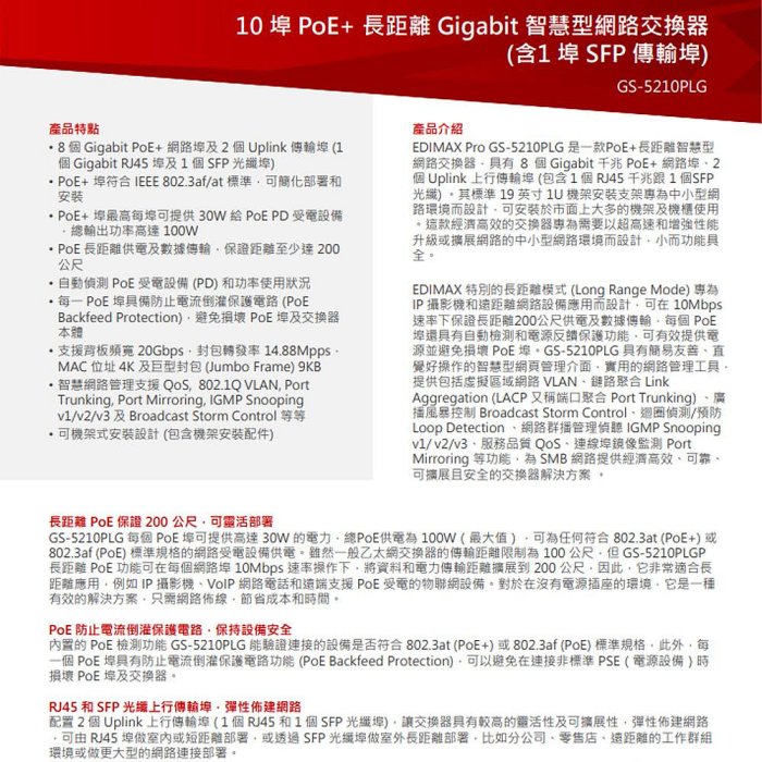 昌運監視器 EDIMAX 訊舟 GS-5210PLG 10埠PoE+長距離Gigabit智慧型網路交換器