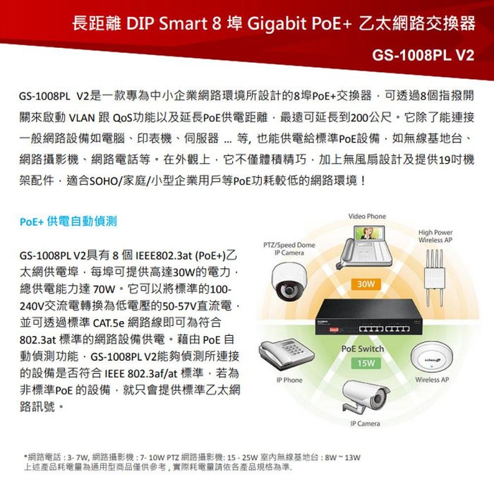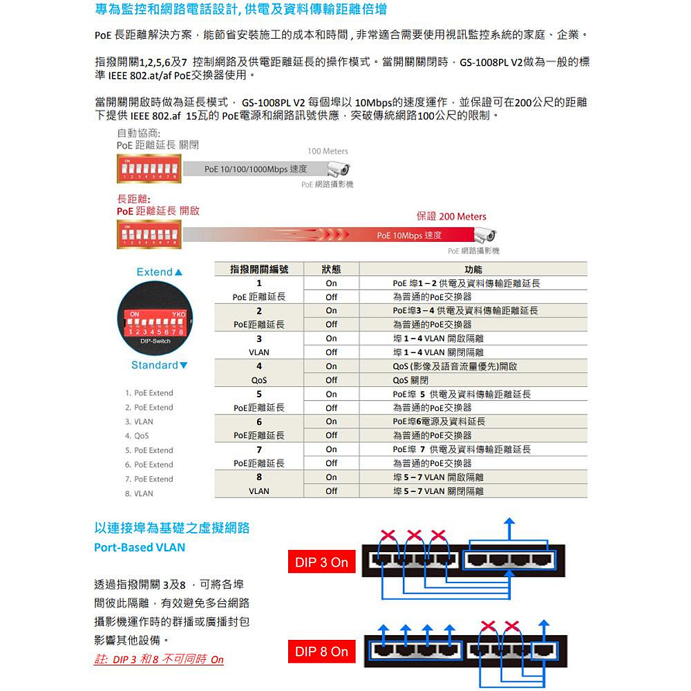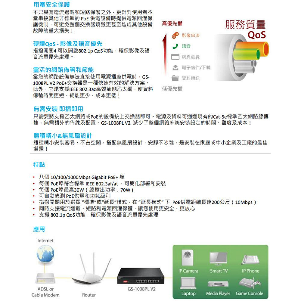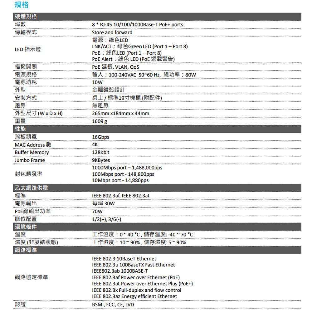 • 八個 10/100/1000Mbps Gigabit PoE+ 埠。• 每個 PoE埠符合標準 IEEE 802.3af/at ,可簡化部署和安裝。• 每個 PoE埠最高30W(總輸出功率:70W )。• 可自動偵測 PoE供電和功耗級別。• 指撥開關用於選擇 “標準”或“延長”模式,在 ”延長模式”。下 PoE供電距離長達200公尺(10Mbps)。• 同時支援電流過載、短路和電源回灌保護,讓您使用更安全、更放心。• 支援 802.1p QoS功能,確保影像及語音流量優先處理。