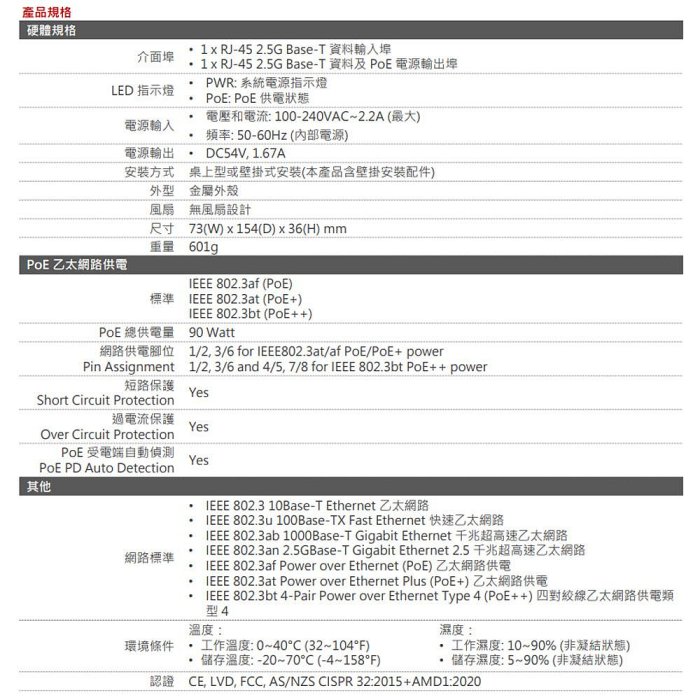 符合相容於 IEEE 802.3af , IEEE 802.3at 及 IEEE 802.3bt PoE 網路供電標準。