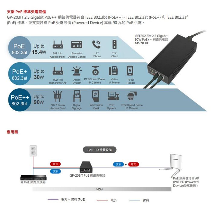 PoE 電源供應器透過 CAT 5E 以上規格網路線佈線網路時,可供電及傳輸資料給距離高達100 米遠的 PoE 設備。