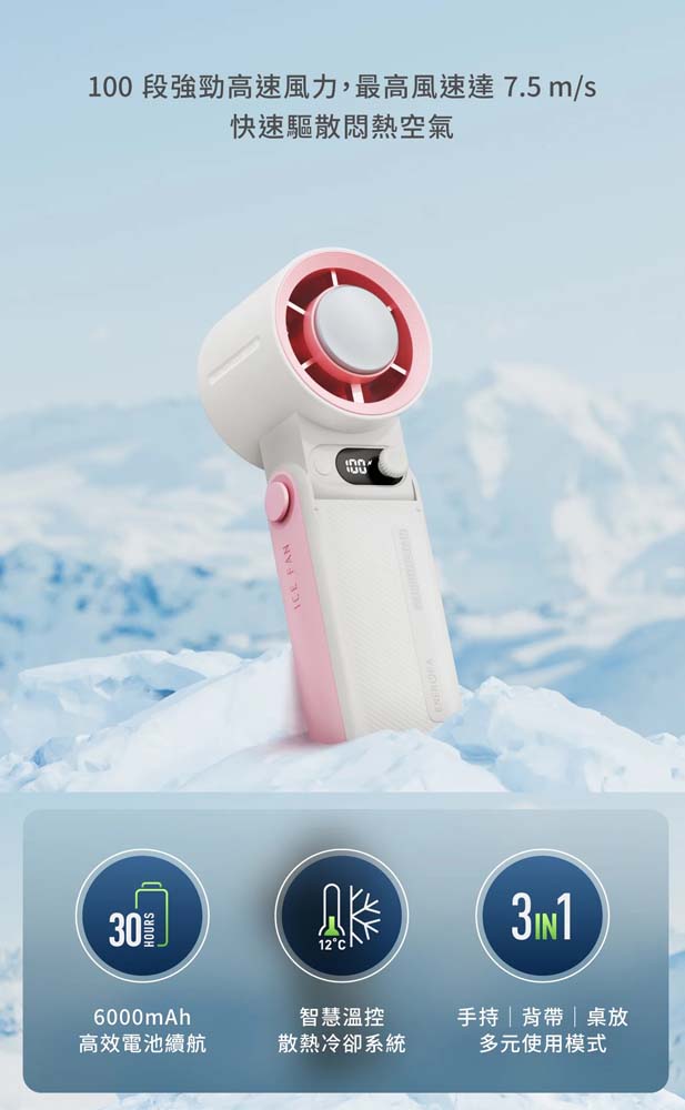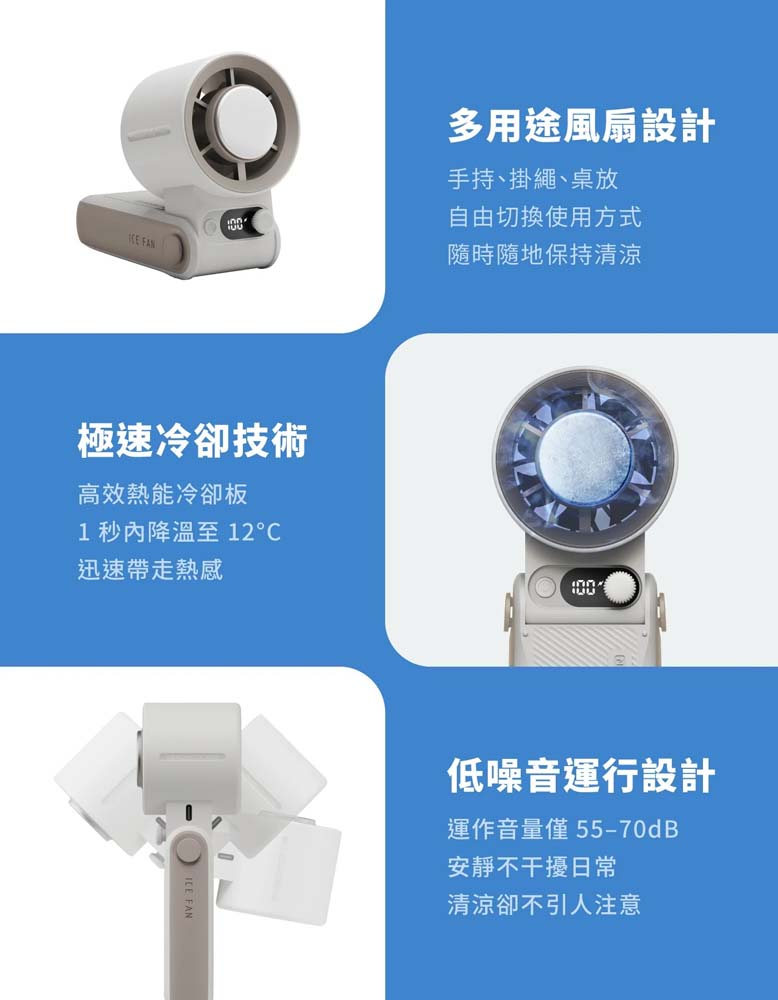 ・雙重降溫設計:風扇氣流 + 冷卻晶片,雙效降溫更清爽。・瞬間冰感降溫:冷卻晶片快速帶來冰涼感。・6000mAh 大容量電池:最長可使用 約 30 小時,長時間外出也不怕沒電。・風速調整:可依需求自由調整風力,打造最舒適的風量。・高速強勁風力:最高風速,有效對抗夏日高溫。・數位電量顯示:清楚顯示剩餘電量,方便掌握使用時間。・多用途使用方式:可手持/掛繩/桌面立放,多情境使用更便利。