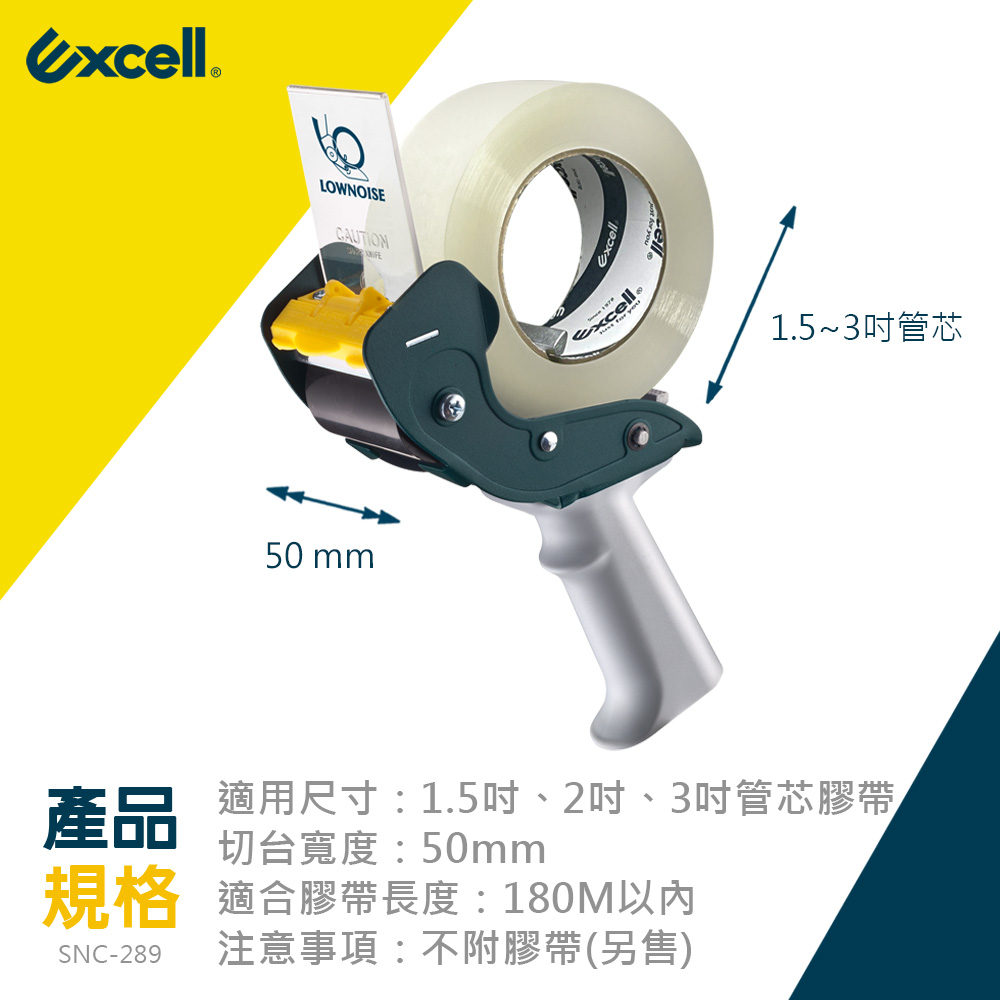 - 品牌:Excell 膠帶切割器 / 握把式封箱切台- 型號:SNC-289- 適用尺寸:1.5吋、2吋、3吋管芯膠帶- 切台寬度:50mm- 適合膠帶長度:180M以內- 注意事項:刀片不可替換- 含2卷150M膠帶 (管芯3吋寬/膠厚48mm/膠帶長度:150M)☆降噪設計:獨特的裝載設計將噪音降至最低,運作平穩安靜,可顯著降低使用時產生的噪音,適用於噪音敏感場所。