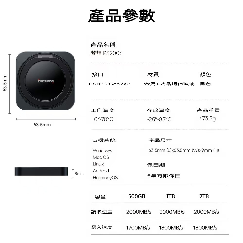 FANXIANGPS2006 500GB Magnetic External Solid State Drive USB3.2Gen2x2 (20Gbps) up to 2000MB/s transfer speed