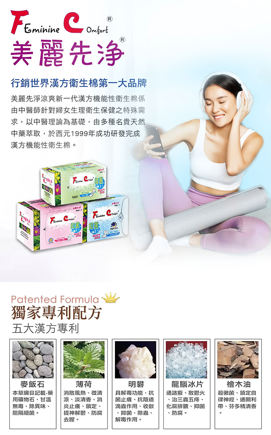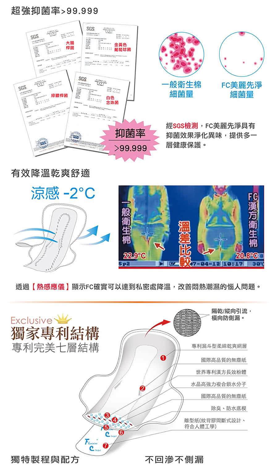抗菌、降溫、長效 ★榮獲國家品質保證金像獎★ ★榮獲國際發明展銅牌獎★ ♫專利夾芯棉層,體感降溫-2度C ♫清爽舒適,無螢光劑、無甲醛、無精油 ♫專利抑止細菌漢方配方,非噴灑於棉層 ♫中醫師以中醫理論為基礎,針對婦女生理衛生保健之特殊需求,以多種名貴中藥萃取研製完成。