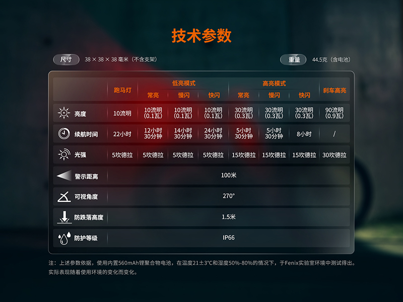 (以下為原廠提供參考數據,非絕對)品名:FENIX BC06R 智能感應剎車高亮尾燈型號:#BC06R