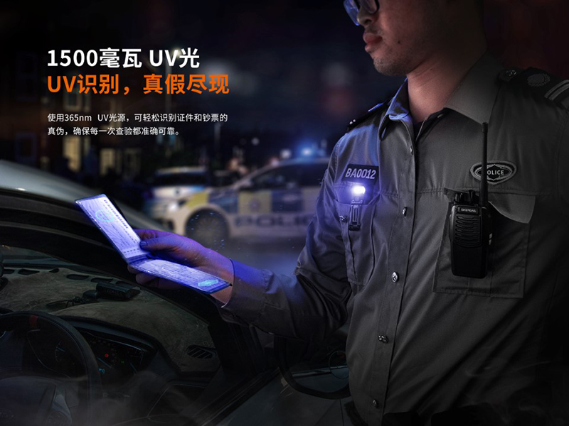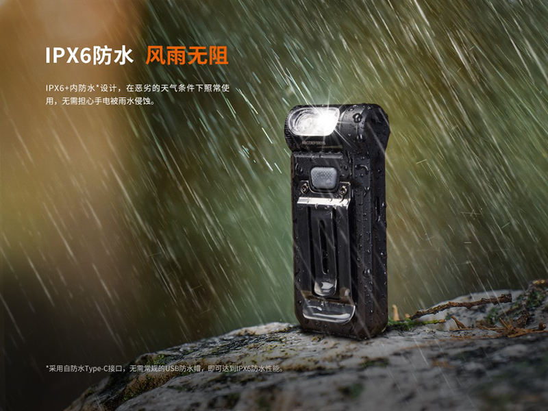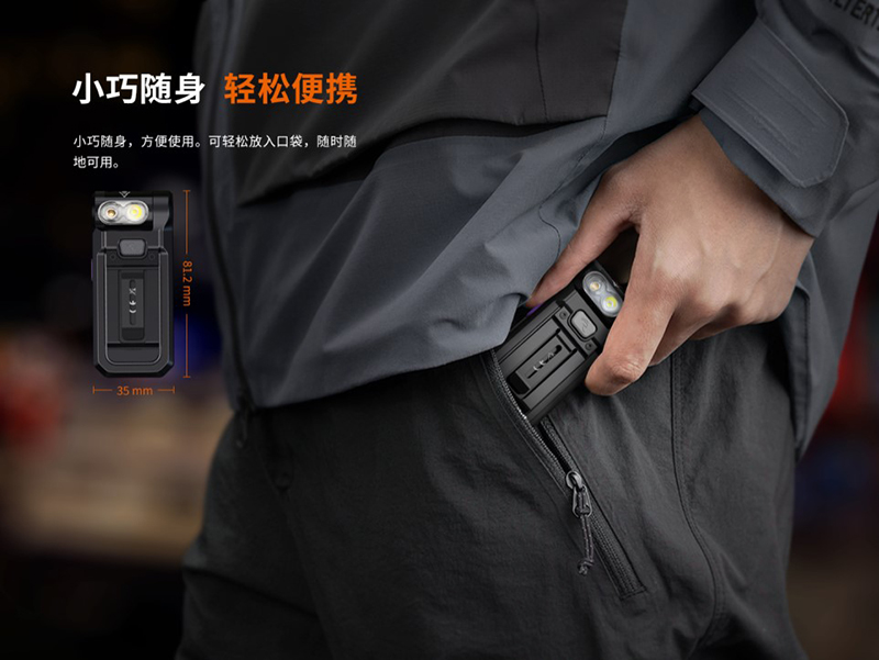 ◎最高亮度達150流明,最遠射程39米。◎採用1顆高性能白光LED和1顆365nm UV LED,壽命50000小時。◎白光/UV光雙光源設計,一燈多用途。◎採用365nm紫外光光源。◎內置700mAh鋰聚合物電池,便捷更省心。◎採用內防水設計的Type-C充電介面,即插即充。◎可向前105°、向後95°旋轉調節燈頭,滿足多角度照明需求。◎一體厚、薄雙夾設計,更好的相容口袋、帽檐等不同厚度夾持。◎尾部磁吸功能,可吸附鐵質表面,有效解放雙手。◎正面白光開關以及側面UV光開關,實現開關,換檔,以及模式切換操作。◎尺寸(±10%):81.2(長)x35(寬)x18(高)毫米。◎重量(±10%):55克(含電池)。