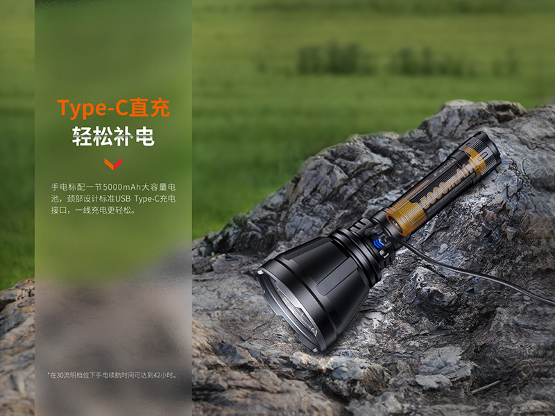 ◎最高亮度2800流明,最遠射程1100米◎使用1顆Luminus SFT70 LED,壽命50000小時◎使用1節21700可充電鋰離子電池供電◎機身帶USB Type-C充電介面,內防水結構◎配備紅光、綠光濾鏡各1片◎可單手操作尾部雙開關,一鍵爆閃◎具有開機電量指示和低壓示警功能◎採用T6061-T6鋁材製造,表面進行了HAIII硬質陽極氧化抗磨處理◎尺寸(±10%):188.5(筒長)×68(筒頭)×25.4(筒身)毫米◎重量(±10%):252.7克(不含電池)