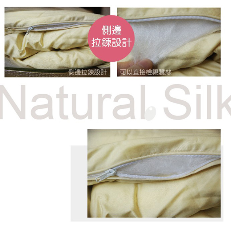 ◎蠶絲被特性1.吸濕保暖性佳 : 蠶絲為動物蛋白質纖維,冬季可預防濕寒氣透入,能迅速吸收並散發人體汗氣,強韌而保暖2.強韌性 : 蠶絲纖維極長而強韌,因此經久耐用,決不斷絲3.質地輕柔,防蹣抗菌 : 觸感柔順細緻,不結塊,透氣不悶熱,服貼較不引起過敏,患有呼吸疾病或過敏體質者尤其適用