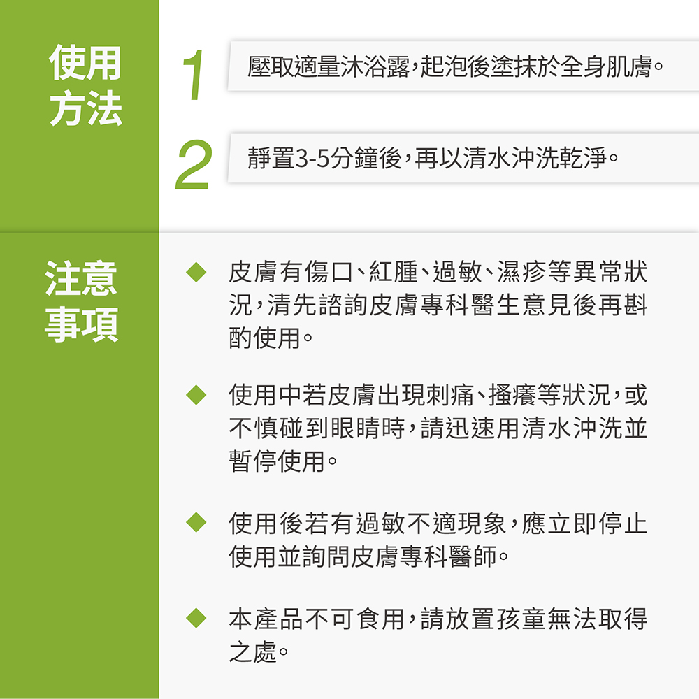 本產品添加多種幫助角質代謝、暢通毛孔的成分,所以沐浴時停留3-5分鐘能更好的讓成份在肌膚作用。