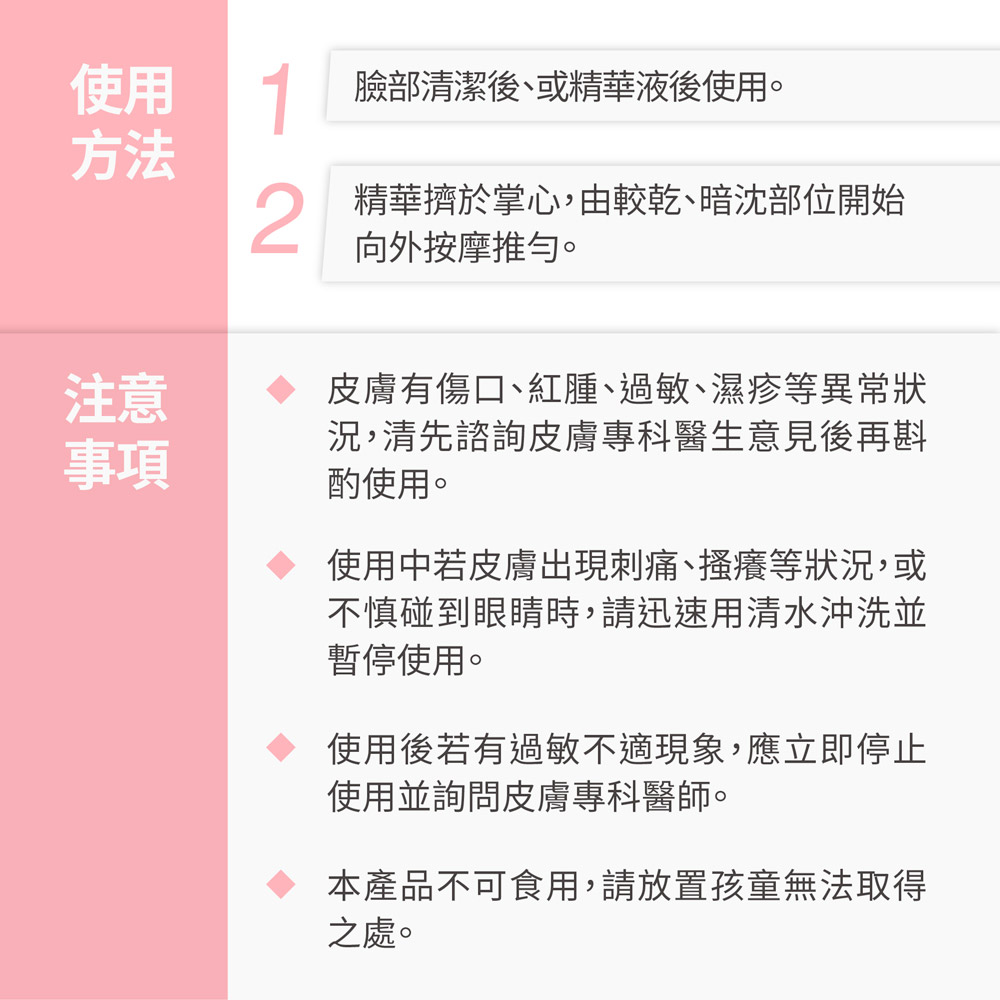 皮膚有傷口、紅腫、過敏、濕疹等異常狀,請先詢皮膚專科醫生意見後再斟酌使用。