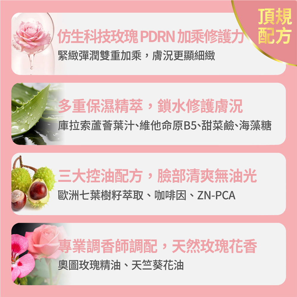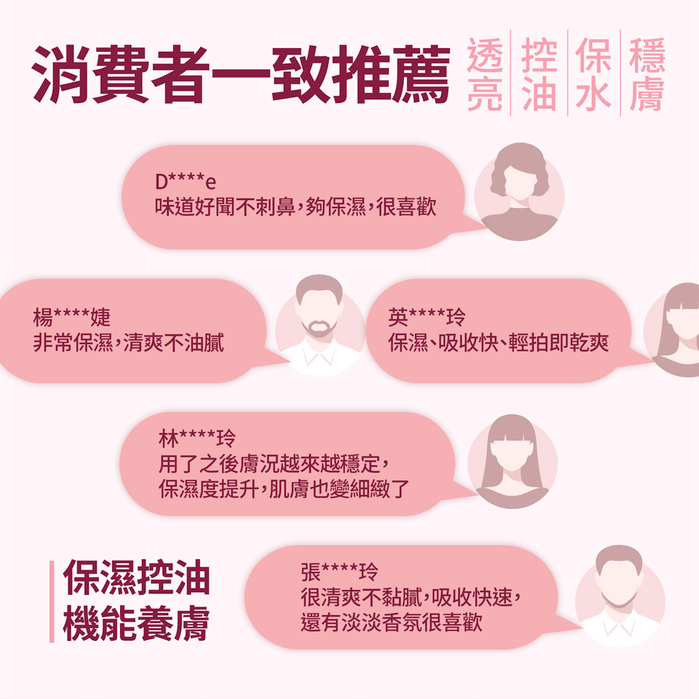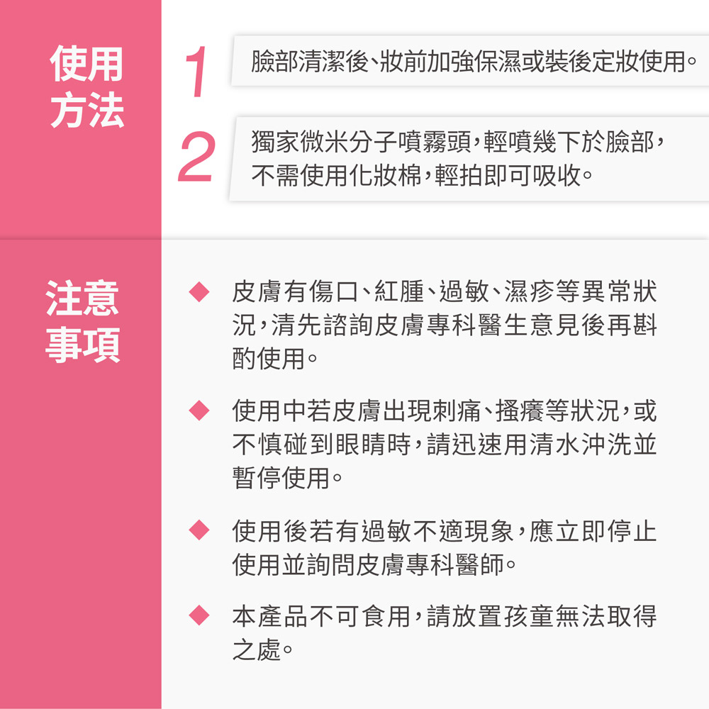 ➤ 適合臉部清潔後➤ 妝後定妝控油使用➤ 舒緩乾燥肌膚➤ 緊緻皮膚有彈性➤ 改善暗沈、提亮嫩白➤ 弱敏肌、修修臉皆適用➤ 不添加人工色素、香料、酒精