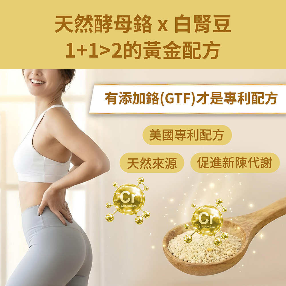 Q5.白腎豆為何要加酵母鉻?因為有添加鉻(GTF)才是有美國功效專利的配方喔!幫助白腎豆體內作用更完整、更加乘!