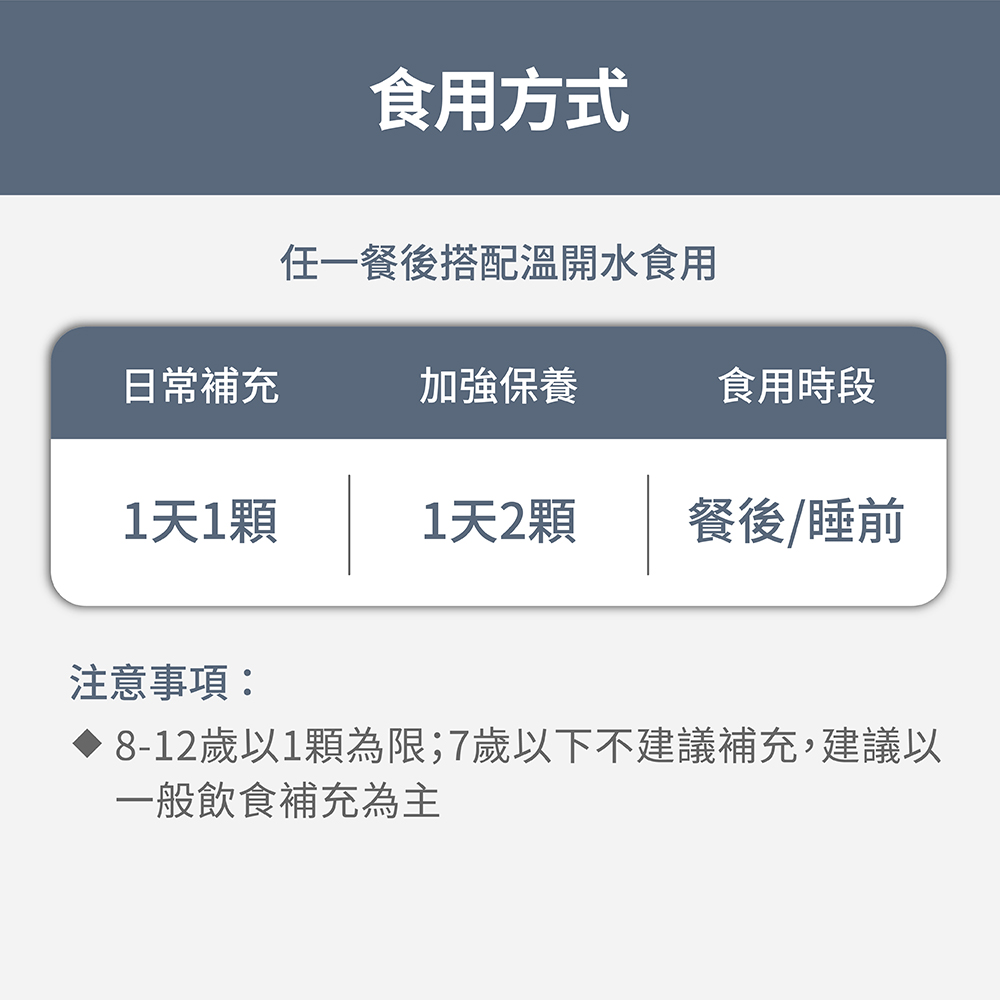8-12歲以1顆為限;7歲以下不建議補充,建議以一般飲食補充為主。