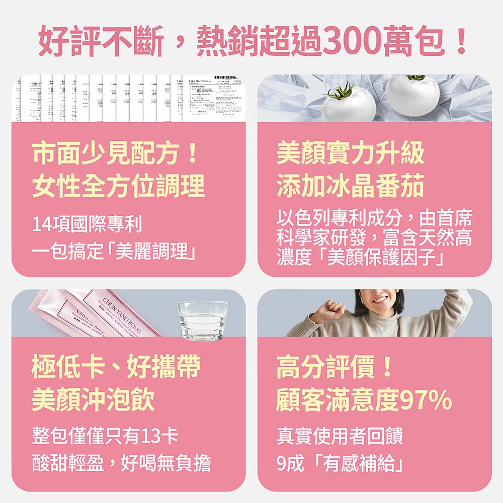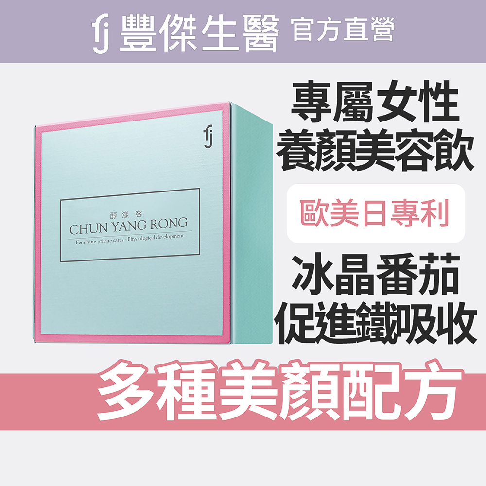 Q1:醇漾容有無雌激素?豐傑的產品皆不含西藥、雌激素,且經過嚴格品質控管,並通過SGS嚴謹把關,請各位可以放心使用!Q2:醇漾容適合哪些人食用?配方皆以成人健康調製,適合各年齡層、素食者也能安心食用,6歲以下幼兒不建議食用。請注意對穀胱甘肽過敏者、孕婦、哺乳期間請選擇【安馨版】。Q3:醇漾容怎麼吃?什麼時間吃?早起空腹食用最佳。建議每天1~3包,1包安心保養,2-3包速效調理,40度以下的開水或飲品沖泡均勻攪拌後飲用。小包裝設計,讓您攜帶方便,外出時可以直接將醇漾容倒入口中搭配水食用喔!Q4:醇漾容可以跟其他產品同時食用嗎?任何產品都不建議同時食用喔!因為怕成分會互相牴觸,建議間隔30分鐘再食用會比較好喔!Q5:請問醇漾容喝起來是什麼味道?充滿淡淡的蔓越莓香氣,好喝到還想續杯,帶有一點點酸甜感,加入冰水、果汁、蜂蜜水飲用更好喝!Q6:請問可以加進飲料食用嗎?可以的!但碳酸飲料及奶製品不建議喔!Q7:請問醇漾容養顏美容的成分是什麼呢?特別添加多種美顏成分,包含專利冰晶番茄、專利穀胱甘肽、白藜蘆醇、琉璃苣油以及專利葡萄籽萃取,還有維他命C、維他命E營養補給,更是養顏美容青春美麗的關鍵!Q8:請問你們的鐵是哪一種呢?我們特別挑選的鐵質為焦磷酸鐵。不僅是鐵含量極高,更沒有鐵腥味的鐵劑,不會有難以入口的問題。Q9:請問抗氧化的成分有哪些?有維生素C、E,也添加了專利穀胱甘肽及專利葡萄籽,更能幫助加倍!Q10:請問女性健康維持的成分是什麼呢?蔓越莓富含花青素、前花青素外,還有專利葡萄籽的原花青素特別通過專利技術萃取,幫助女性健康維持喔!---------------------------------------------------------------【使用方式】每日1-3包;搭配40℃以下開水或飲品、果汁沖泡飲用增添風味。【產品功效】養顏美容、具抗氧化作用、私密呵護、紅潤氣色、營養補給、調節女性生理機能、擁有7項歐美專利榮獲2021歐洲品質評鑑大賞、14項歐美日專利配方、特選專利以色列冰晶番茄、幫助調整體質、調節生理機能【產品特點】孕婦可選擇【安馨版】不含專利穀胱甘肽、琉璃苣油✔ 榮獲2024歐洲品質評鑑大賞✔ 每天1包 空腹食用較佳✔ 14項歐美日專利配方✔ 特選專利以色列冰晶番茄✔ 美國FDA-GRAS成分認證 ✔ 嚴選日本大廠KOHJIN出品 穀胱甘肽✔ 礦物質 鐵,幫助養顏美容✔ 維生素C 抗氧化、促進鐵的吸收✔ 維生素E 有助於減少自由基的產生✔ 調整體質、調節生理機能✔ 女性健康維持【主要成分】葡萄糖、蔓越莓果汁粉、麥芽糊精、綜合果汁粉、維生素C、檸檬酸、香料粉、專利葡萄籽萃取、果寡糖、二氧化矽、專利穀胱甘肽、維生素E、蔓越莓萃取、洋菜粉(寒天)、甜菜根粉、琉璃苣油粉、紅石榴萃取物、黑木耳萃取粉、紅酒萃取(含白藜蘆醇)、焦磷酸鐵(鐵)、專利冰晶番茄、SOD綜合蔬果酵素粉。【商品規格】容量規格: 4g/包、 30包/盒保存期限: 2年貨源: 公司貨產地: MIT劑型:粉末【注意事項】1. 孕婦、哺乳及嬰幼兒請勿食用。2.對穀胱甘肽過敏者請勿食用。2.對穀胱甘肽過敏者請勿食用。