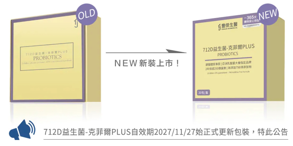 Q1.益生菌怎麼保存?建議存放陰涼乾燥處(25°C),避免日光直射與高溫潮濕,溫度過高時建議冷藏保存。Q2.益生菌怎麼吃?什麼時候吃?許多人都會問益生菌到底要早上吃還是晚上吃,我們建議每日一包,任一時間搭配冷水食用即可;若有在食用抗生素、蜂膠、大蒜精、咖啡、濃茶等建議間隔1-2小時候食用。Q3.小孩幾歲可以食用?通常嬰兒6個月後較穩定,可以開始吃副食品的時候即可開始接觸食用囉!Q4.益生菌會有依賴性嗎?「益生菌可以長期吃嗎」答案是可以的,產生依賴性的說法是網路錯誤謠傳,無科學根據,因體內益生菌具有繁殖力,在條件允許下可以自行生長,因此長期補充外來性的益生菌,我們並不會喪失自身繁殖益生菌的能力,所以就不會產生依賴性喔。Q5.可以跟蔬果酵素EX一起吃嗎?可以喔~兩者一起補充加強調理最好。Q6.什麼是益生質(益生元)?簡單來說,益生元是益生菌的食物,有了益生元,更能相輔相成,定殖更順利!建議益生菌一定要挑選含有益生元的產品。Q7.益生菌生理期可以吃嗎?可以喔~712D益生菌-克菲爾PLUS的補充在於改變細菌叢生態、幫助維持消化道機能,不影響生理期狀態喔!Q8.孕婦可以吃益生菌嗎?712D益生菌-克菲爾PLUS有國際無添加協會Anti-Additive協會100%無添加驗證標章,成分純粹!孕媽咪可以安心食用喔!Q9.益生菌一定要冷藏儲存嗎?舒適的溫度下可儲存室內,但在酷夏、無冷氣、密閉空間請放置冷藏喔!不過冷藏條件不一,建議開封後在一年內食用完畢最佳。Q10.請問712D益生菌裡面含有哪些菌種?712D益生菌-克菲爾PLUS含專利菌株,全桿菌不含球菌、無添加、無調味劑。 選用菌株為乳雙歧桿菌BAL06、植物乳桿菌LP28(專利菌株)、鼠李糖乳桿菌LRH113(專利菌株)、發酵乳桿菌LF26、副乾酪乳桿菌LPC12、鼠李糖乳桿菌LRH10、長雙歧桿菌BL986、嗜酸乳桿菌LA1063。Q11.此次升級對於調整體質有幫助嗎?有的,原本一天2包調整體質,現在只要一天一包調整體質,而且每天調整體質需求成本直接從68元降到42.6元,幫助調整體質CP值更加提升。--------------------------------------------------------------【使用方式】每日1包,可任一時間搭配冷水食用,幫助消化、改變細菌叢生態、調整體質。【產品功效】100%純淨無調味、拒絕794項食品添加物、SYNPACK®領先科技、712天保證活菌數250億、優質全桿菌不添加球菌。712天保證活菌250億、全桿菌益生菌,不添加球菌、實驗證實,7大菌種通過酸鹼考驗、100%純淨無添加A.A.驗證【產品特點】✔ 每天1包,幫助調整體質營養補給效率4倍升級✔ 2年250億保證菌數+後生元克菲爾M1 業界目前最頂200億✔ 全台領先獲得調整體質發明專利的克菲爾桿菌M1✔ 益生菌新科技黃金三角配方-益生元X益生菌X後生元✔ 特選全台首屈一指益生菌製造龍頭大廠✔ SYNPACK®創新科技穩定益生菌狀態✔ 連續3年榮獲國際A.A.100%無添加驗證✔不含797項食品添加物✔ 100%全桿菌保證✔ 3大品質管控、68道監測點✔ 耐胃酸、耐膽鹼、定植力高、穩定性高✔ 榮獲榮獲乳酸菌協會創新產品、國家磐石獎等殊榮✔ 輕巧好攜帶、健康不受限【主要成分】果寡醣粉(非基改玉米澱粉、果寡醣)、乳酸菌(動物(乳)雙歧桿菌BAL06、植物乳桿菌LP28(專利菌株)、鼠李糖乳桿菌LRH113(專利菌株)、熱激化克菲爾乳桿菌M1、醱酵乳桿菌LF26、副乾酪乳桿菌LPC12、鼠李糖乳桿菌LRH10、長雙歧桿菌BL986、嗜酸乳桿菌LA1063)、半乳寡醣(半乳寡醣、乳糖、葡萄糖、半乳糖)。【商品規格】容量規格: 2公克/包 ; 30包/盒保存期限: 2年貨源: 公司貨產地: MIT劑型:粉末【注意事項】1.對乳品及大豆製品過敏者,不建議食用。2.若有特殊情況者,使用前請先諮詢醫師、營養師。