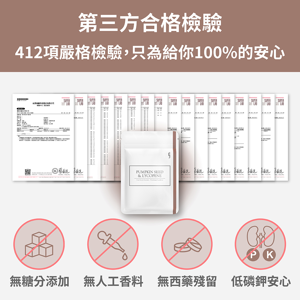專利南瓜籽萃取物(南瓜籽萃取物、麥芽糊精)、麥芽糊精、蕃茄萃取物(含茄 紅素)(番茄萃取物、麥芽糊精)、刀豆萃取物(專利白鳳豆)、葡萄糖酸鋅、專利黑麥 花粉(微結晶狀纖維素、麥芽糊精、黑麥花粉萃取粉、二氧化矽、硬脂酸鈣、磷酸二 氫鈣、阿拉伯膠)、硬脂酸鎂。
