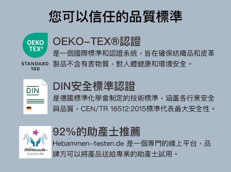 以 100% 再生聚酯纖維精密 3D 編織製成,通過 OEKO-TEX® STANDARD 100 無毒安全標準,並榮獲國際髖關節發育不良研究所 (IHDI) 認證,給寶寶最安心的支撐