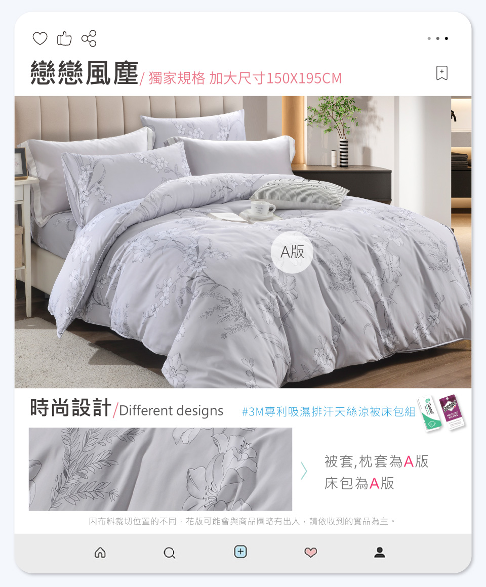 ☆3M專利吸濕排汗速乾☆獨立筒適用床包加高35CM☆附贈天絲認證吊卡品質有保障【天絲涼被床包組】◆商品組合:雙人薄床包x1+舖棉涼被x1+薄枕套x2;共4件/組◆產品內容/材質/清潔方式:◆雙人薄床包x1-5x6.2尺(152x188公分) /可包覆床墊高度:35±1公分◆舖棉四季被/涼被x1-5x6.5尺(150x195公分)◆薄枕套x2―45x75公分◆材質―.表布/底布:55%萊賽爾(天絲)+45%聚酯纖維(3M專利吸濕排汗處理).裡布/填充物-100%聚酯纖維.顏色-如產品圖示,網頁圖片因拍攝關係,與實品略有差異,實際顏色及款式以出貨為主.清潔保養方式-可水洗/不可烘乾/不可漂白/勿使用強力漂白清潔劑/浸泡時間請勿超過20分鐘/建議可放入大型洗衣袋後再清洗(因深色布料請勿使用含漂白劑之洗劑,盡量避免浸泡,深淺色寢具請分開清洗)◆注意事項:◆商品如經拆封、使用過、清洗過或拆解以致缺乏完整性及失去再販售價值時,恕不接受退換貨!◆商品若欲辦理退款依法需先恢復商品原狀,否則需支付恢復商品原狀之費用方得辦理退款(新品瑕疵除外)。◆此商品圖為參考用之情境圖示,產品內容以規格敘述內容為準◆因布料裁切位置的不同,部份花版可能會與商品圖略有出入,請以收到的實品為主◆商品退換貨,需有外包裝破壞袋包覆,如商品提袋包裝汙損將無法退換貨,需另補償整新費◆送達地點有否限制:限台灣本島地區,外島恕不接單◆ BSMI許可字號:M37045