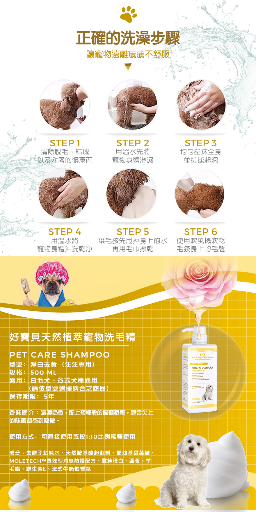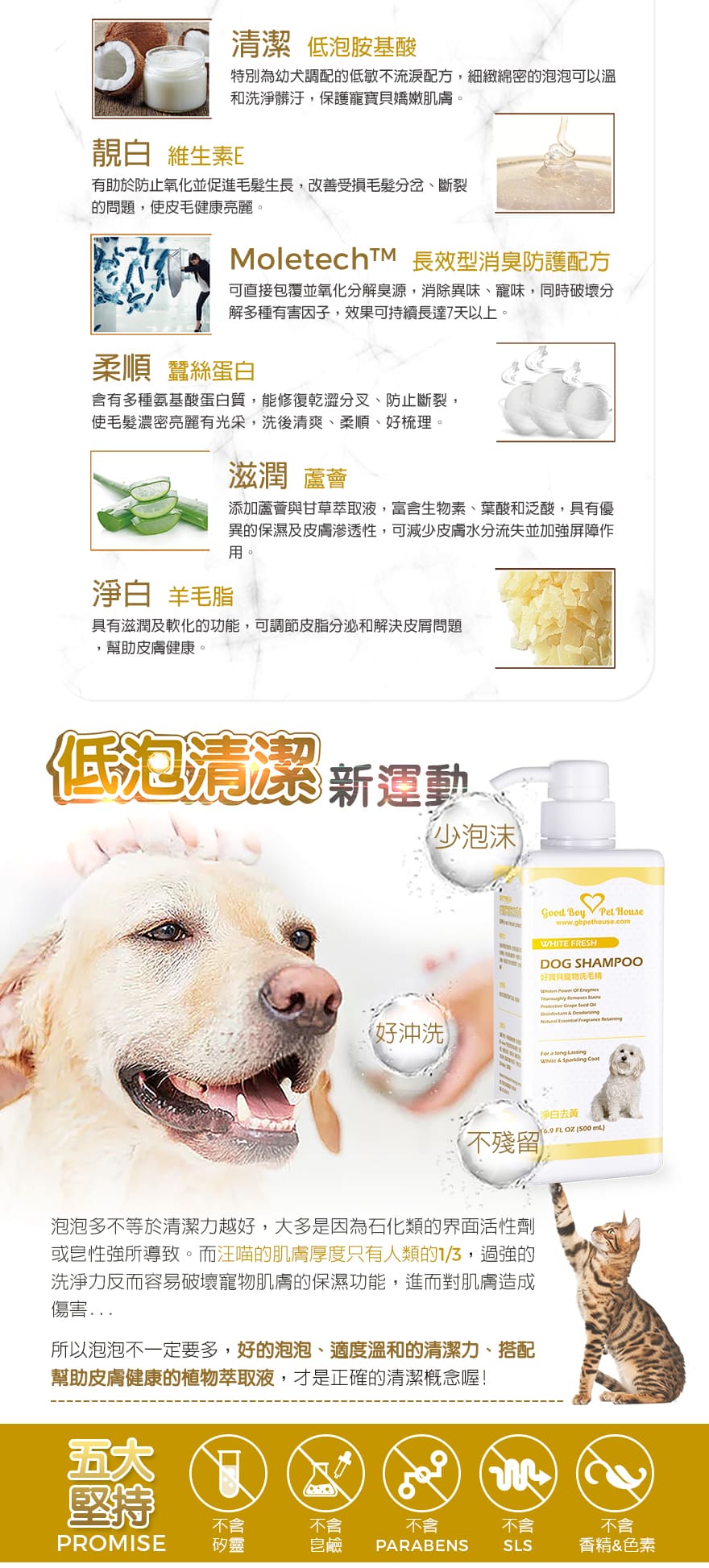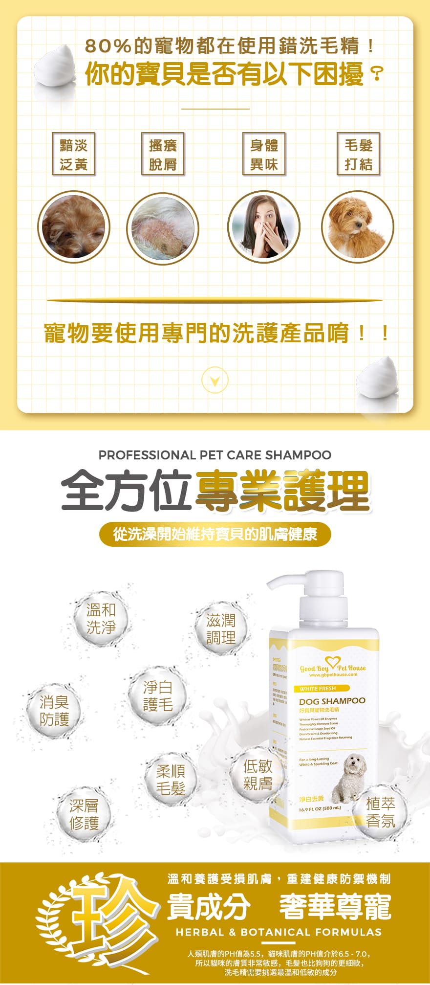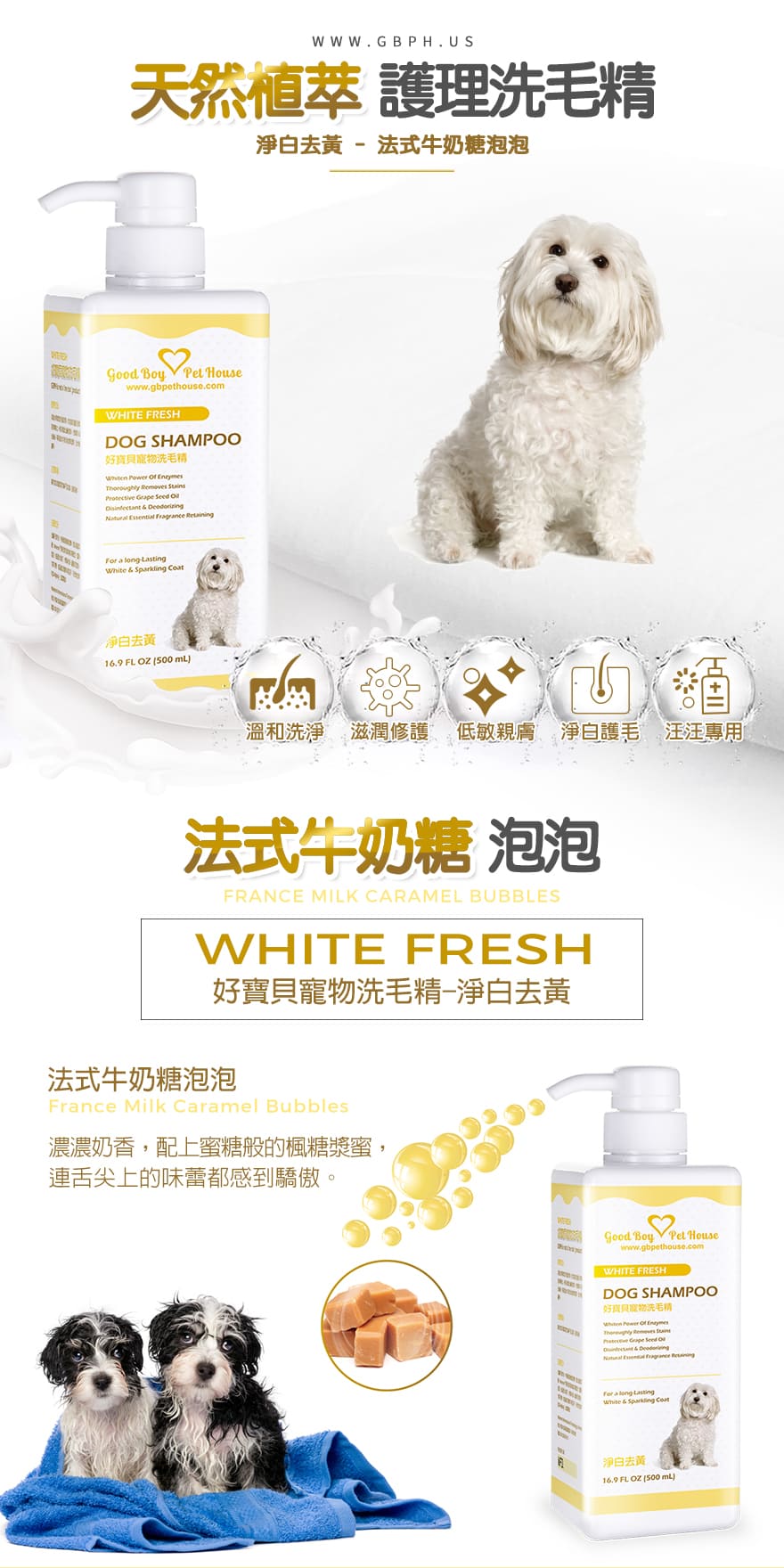 天然植萃淨白去黃寵物洗毛精 特別用來給想要幫白色毛髮寵物保養洗澡用的~ 牛奶糖的香氣非常可愛喲!不含螢光劑與漂白成分, 是特別專為白毛犬加強淨白所研發的專用洗毛精。 ◆專為白毛犬加強淨白所研發 ◆植萃潔淨配方有效淡化黃垢與污漬 ◆防護除臭、修護肌膚、柔順毛髮 ◆不含螢光劑、漂白成分,無毒低敏