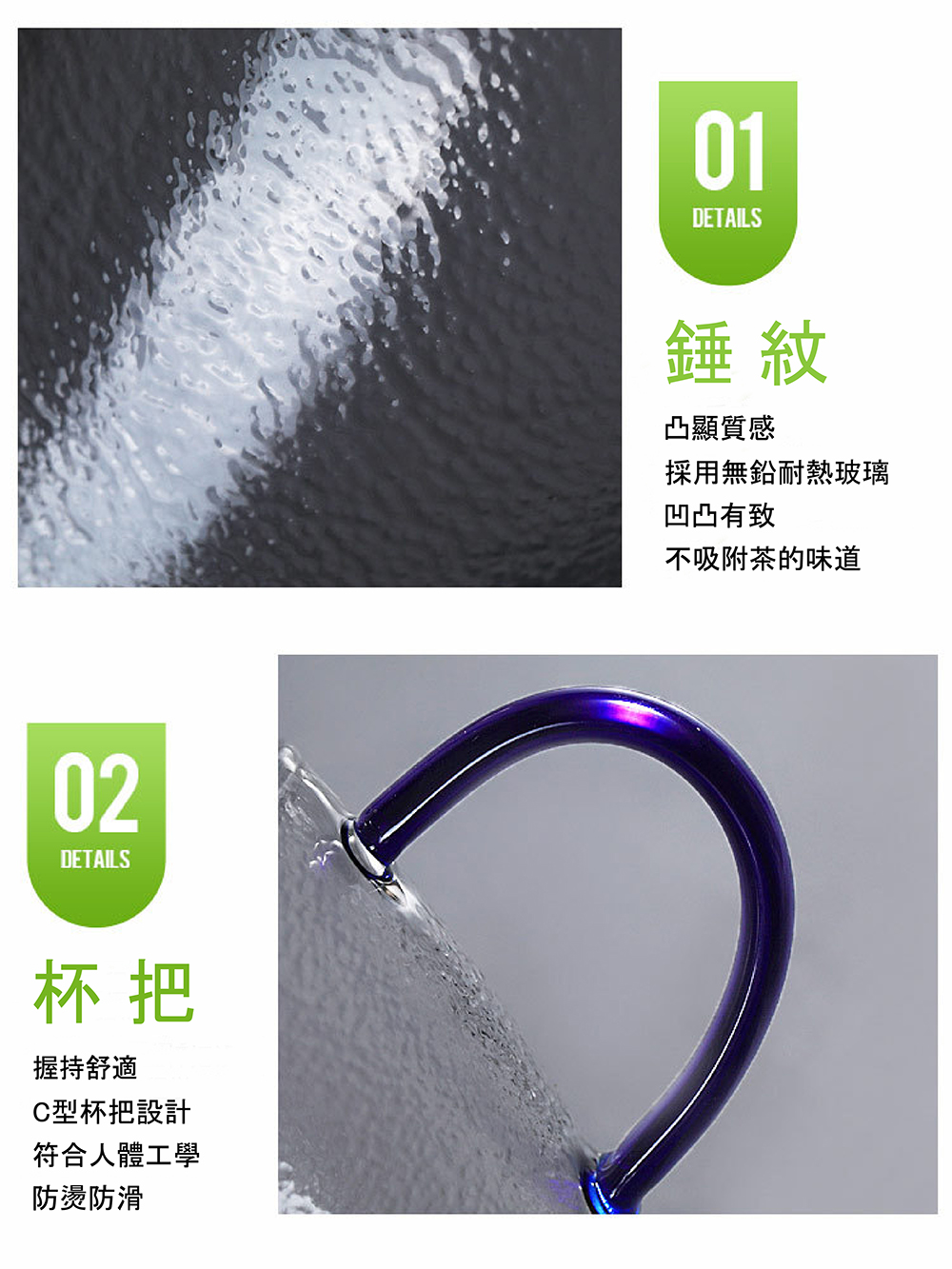 側邊玻璃把手高溫熔接杯身,結構穩定,提供良好握持感,適合盛裝熱飲時使用,減少燙手風險