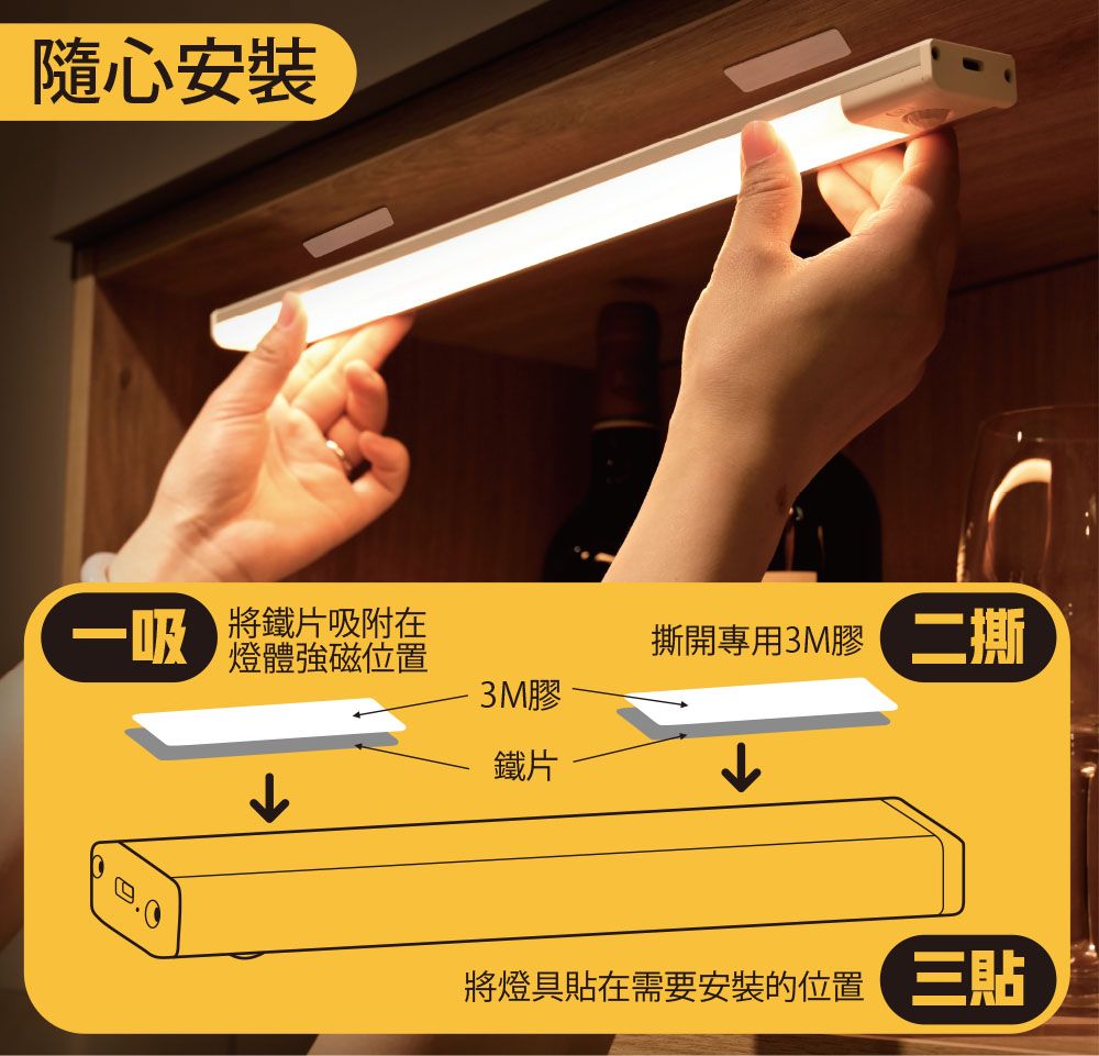 將鐵片吸附在燈體強極位置.撕開專用3M膠.將燈具貼在需要安裝的位置