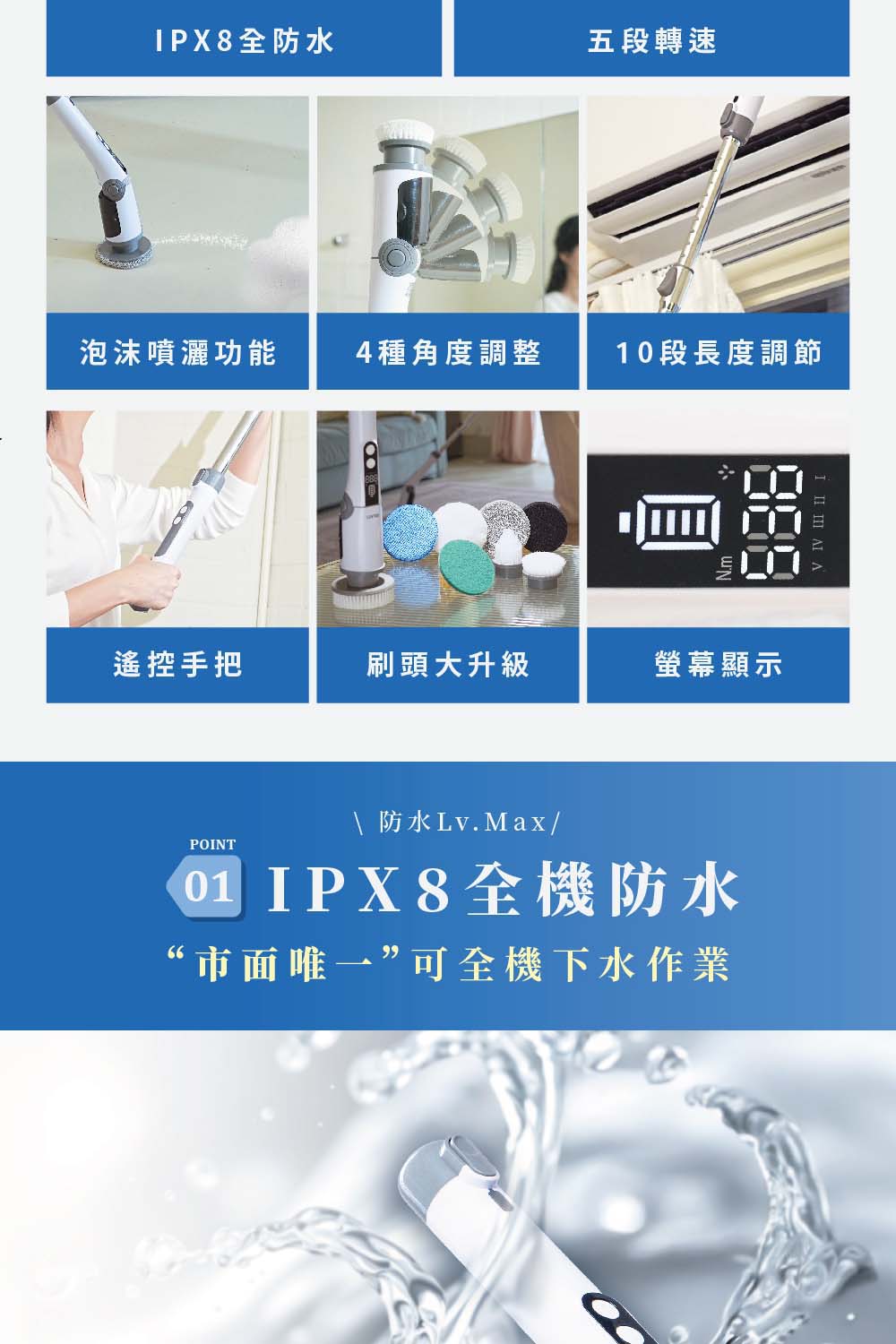 A: 全機IPX8級全防水,業界唯一可水下作業。唯一需注意將充電孔蓋緊以防止電機進水短路。