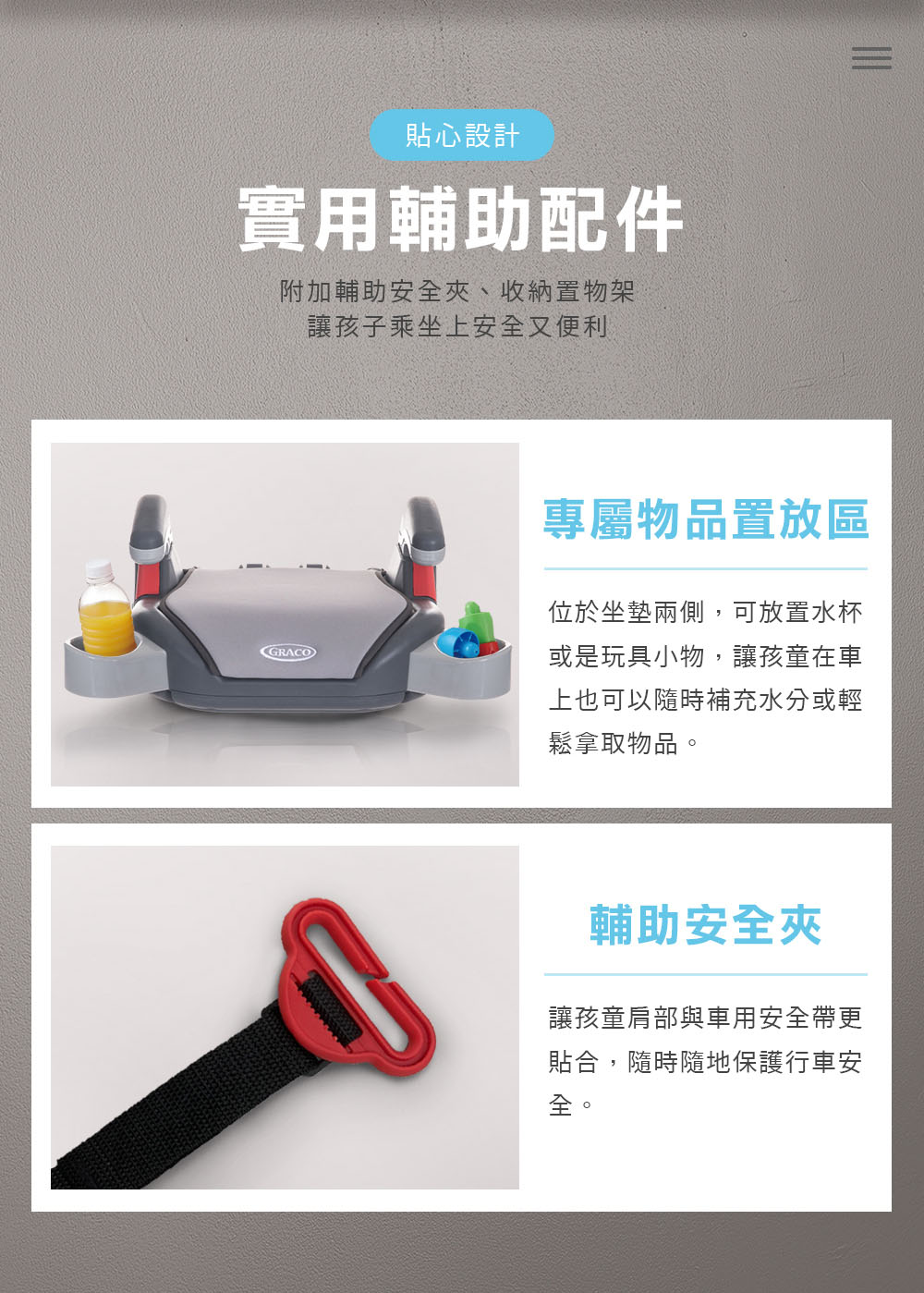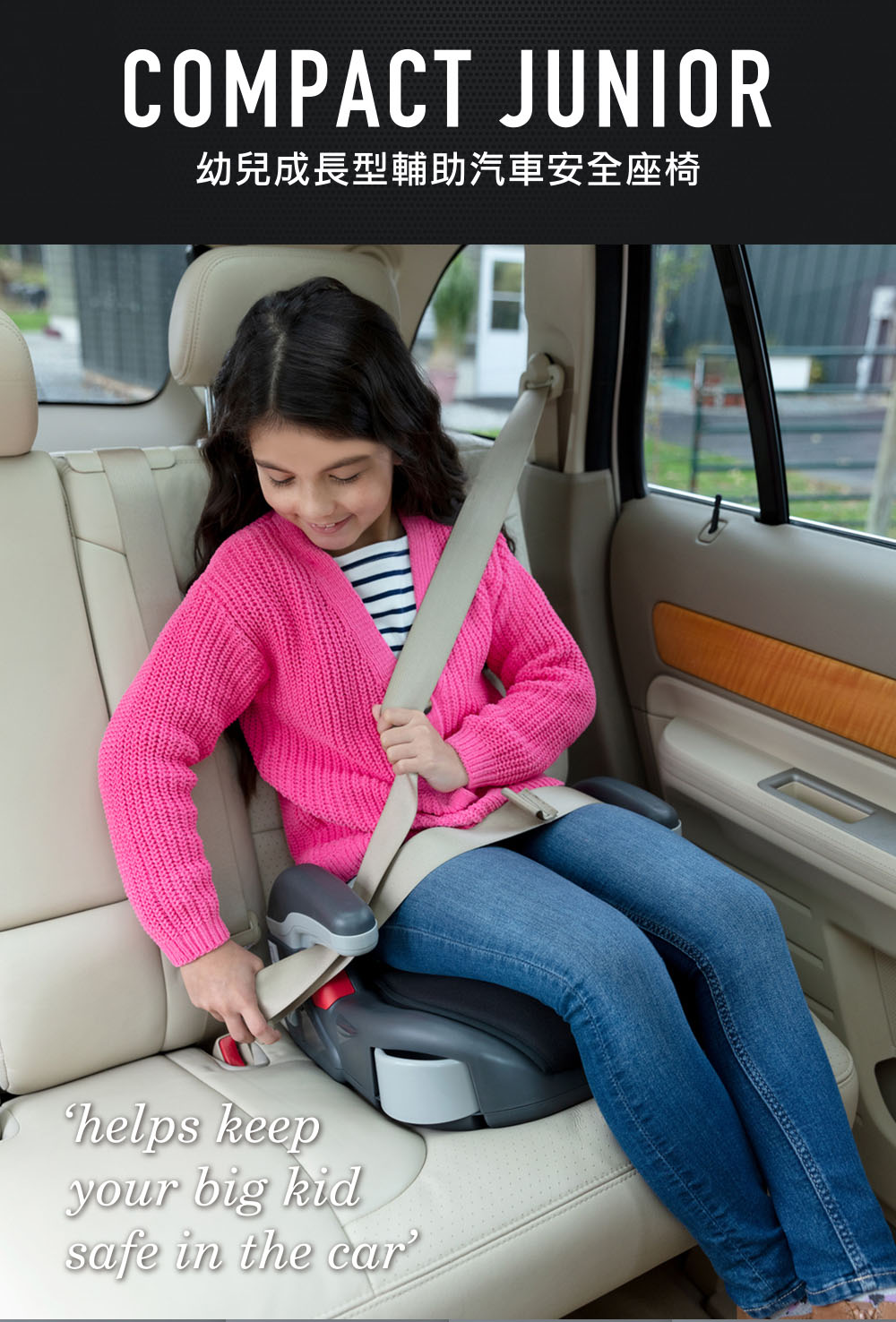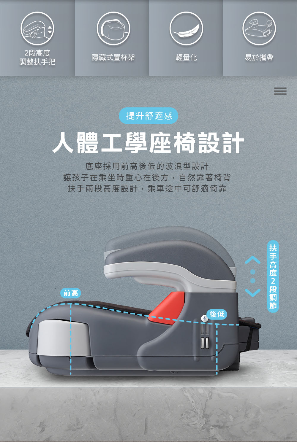 搭配車用三點式安全帶使用,保護孩童行車安全。貼心機能設計:兩段扶手高度可調整,坐墊可清洗,易於保持清潔。附物品置放處,拿取隨身小物更加便利。