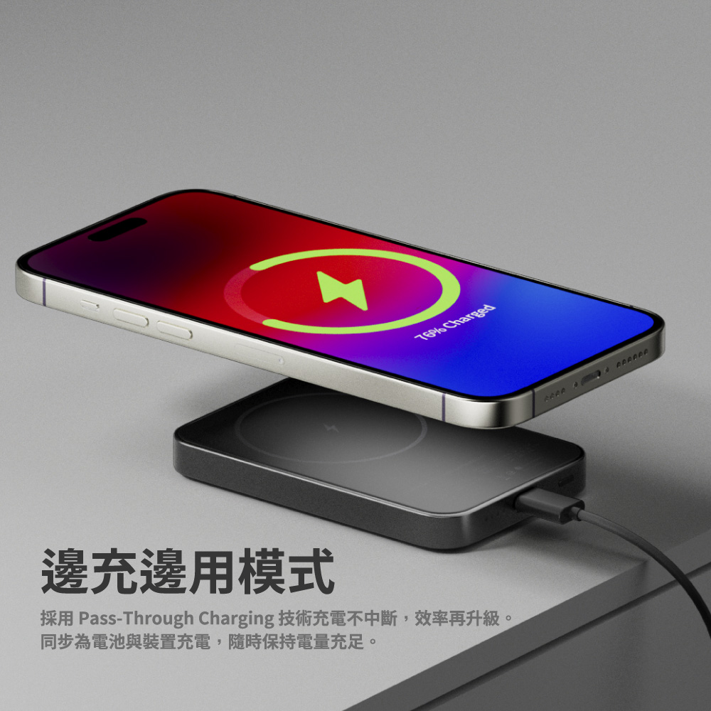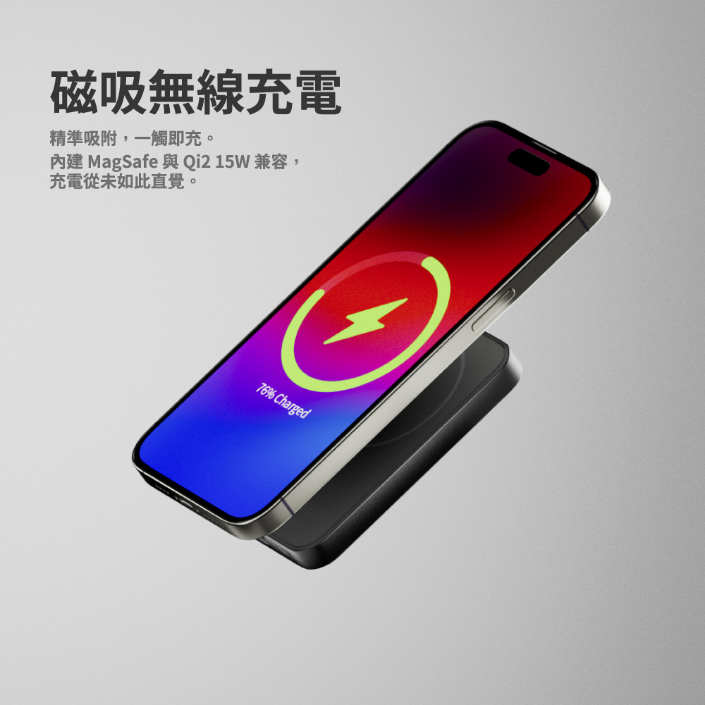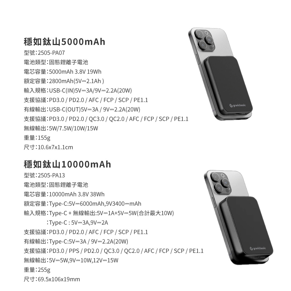 ● 固態鋰電池技術,更安全更穩定● 支援Qi2無線充電● 支援Airpods及Apple Watch無線充電● 雙USB-C有線快充穩如鈦山5000mAh型 號:2505-PA07電池類型:固態鋰離子電池電芯容量:5000mAh 3.8V 19Wh額定容量:2800mAh(5V⎓2.1Ah)輸入規格:USB-C(IN)5V⎓3A / 9V⎓2.2A(20W)支援協議:PD3.0 / PD2.0 / AFC / FCP / SCP / PE1.1有線輸出:USB-C(OUT)5V⎓3A / 9V⎓2.2A(20W)支援協議:PD3.0 / PD2.0 / QC3.0 / QC2.0 / AFC / FCP / SCP / PE1.1無線輸出:5W / 7.5W / 10W / 15W材 質:鋁合金+2.5D磨砂玻璃重 量:155g尺 寸:10.6×7×1.1cmNCC:CCAH25LP6590T7BSMI:R3E377
