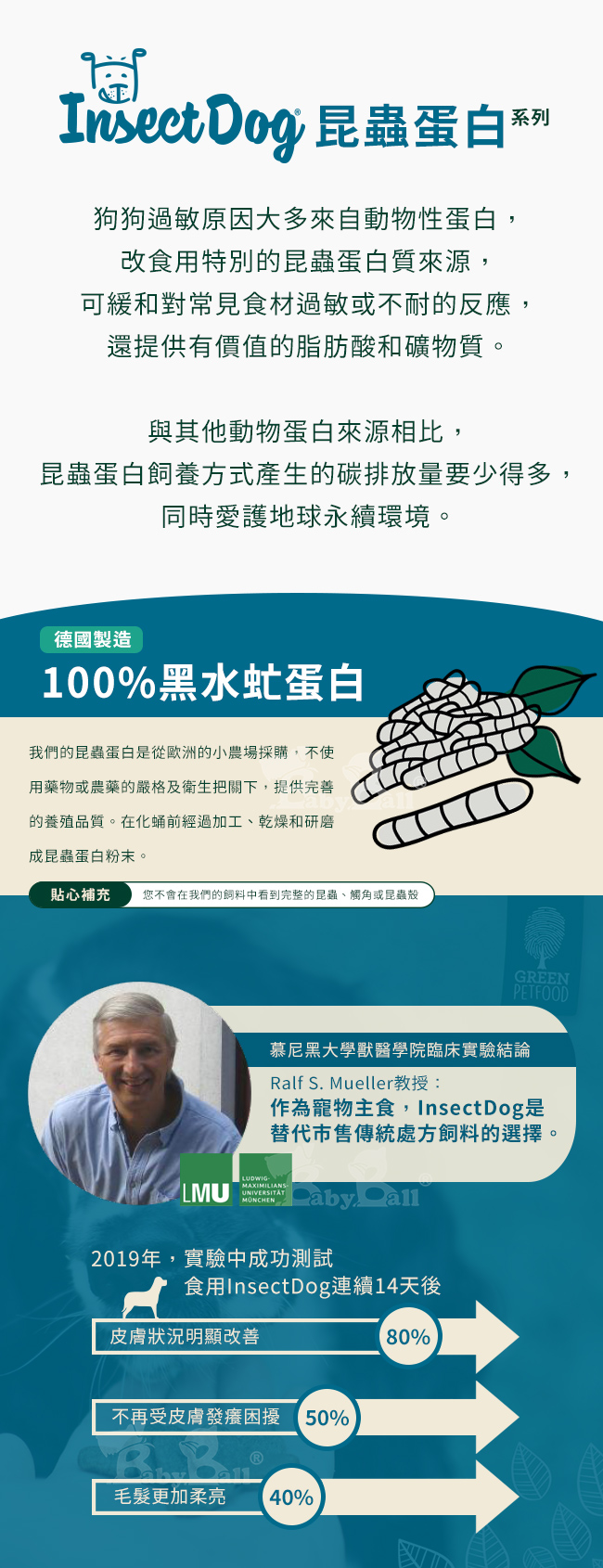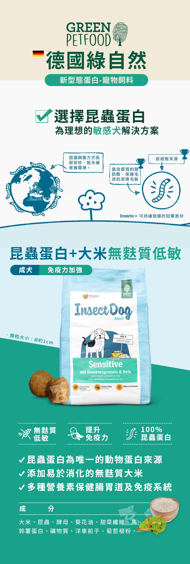 ● 添加無麩質大米幫助消化。●多種營養素維護腸胃健康及自然抵抗力。●100%昆蟲蛋白唯一動物蛋白來源。●採用昆蟲、蔬食替代動物性蛋白質。●新型態蛋白質來源,減少碳足跡,友善環境。●由營養學家、動物專家和獸醫共同研發,不使用動物測試。●無麩質低敏,不含人工色素,調味劑和防腐劑。【德國原裝原袋進口 】【多項獎項及認證把關 】●Green Brand生態可持續發展奬19/2020和21/2022最先獲得此項殊榮的德國寵物業者。●德國petonline.de 16/2017和17/2018創新產品奬。●榮獲德國DLG優質寵物食品認證,生產過程經過嚴格檢測和審核。●榮獲MeinAllergie Portal數位健康英雄獎。●ISO 9001:2008品質管理認證。●通過環境管理審核規章。●通過國際食品標準認證。※您不會在我們的飼料中看到完整的昆蟲、觸角或昆蟲殼。