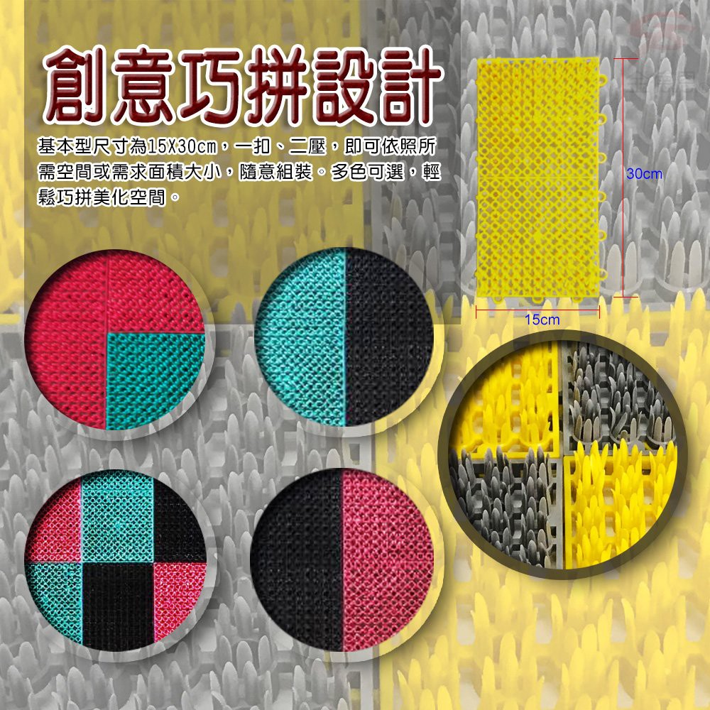 https://youtu.be/HZyJoad5dSY●台灣製造,品質保證 ●自行拼接,大小由你決定 ●鏤空墊高,便於排水避免阻塞 ●毛刷設計,簡易清潔與止滑效果GS01833 【產品規格】 材 質:塑膠 產品尺寸:30x15x2.1cm/塊(±5%) 包裝尺寸:2.5x16.5x14cm 產品重量:188g/塊(±5%) 重量(含包裝):1800g(±5%) 數 量:1組8片 顏 色:隨機顏色 產 地:台灣 【注意事項】 ※ 商品退換貨,請保持原樣貌及外包裝, 如有缺件或包裝不完整之情形, 則可能產生整新之費用 ※ 商品退換貨,請勿在原包裝上張貼或寫字 ※ 僅限新品瑕疵退換貨(猶豫期並非試用期) ※ 退換貨,請妥善保存購買憑證、發票等證明文件 ※ 電腦螢幕會產生色差,顏色以實際產品為主#塑膠地墊 #地墊 #塑膠毛刷地墊 #毛刷地墊 #防滑地墊 #毛刷防滑地墊 #浴室地墊 #玄關地墊 #花園地墊 # # #