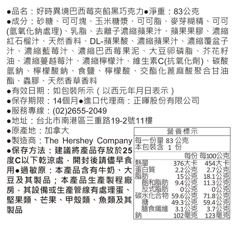 ◎Brand:Hershey's 好時 ◎Specifications: 83g克 x 1 x 1Bag袋