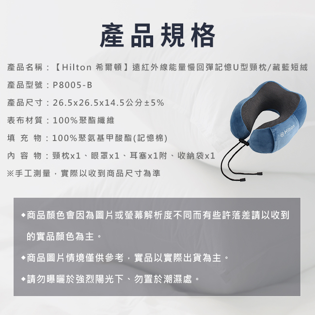 產品名稱:【Hilton 希爾頓】遠紅外線能量慢回彈記憶U型頸枕/藏藍短絨