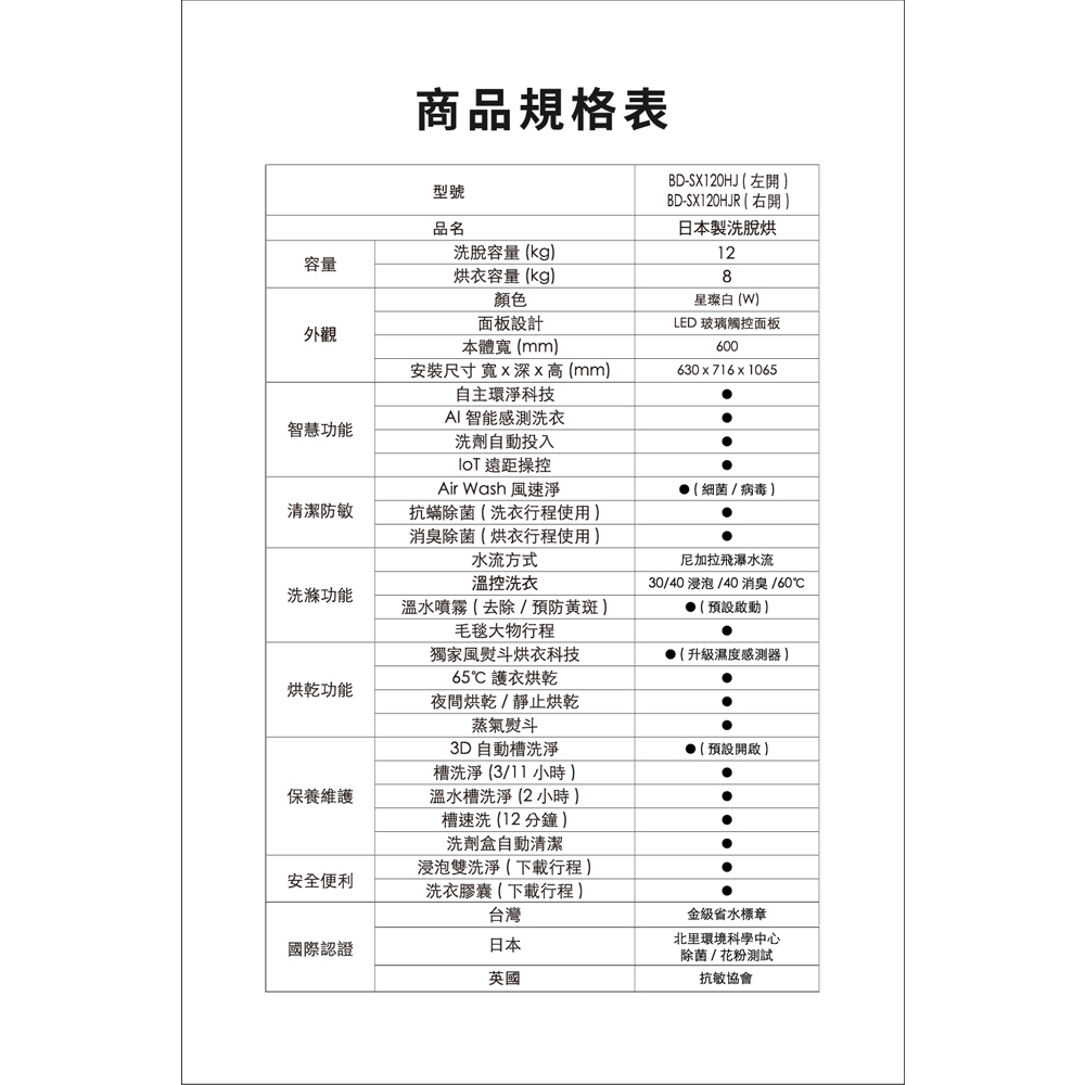 ■ 商品送達後若因買家因素無法安裝或拒收,買家需負擔賣家出貨產生的物流費用商品特色:全新自主環淨科技 省去清潔與保養AI智能感測洗衣 省去繁瑣聰明洗衣洗劑自動投入 洗衣輕鬆便利4段溫控洗淨高效抗敏除菌65℃低溫風熨斗Air Wash風速淨 守護衣物除菌除病毒IoT智能遠端操控洗衣槽速洗12分鐘 快速保養筒槽商品規格:型號:BD-SX120HJ 左開/ BD-SX120HJR 右開容量:洗脫 12kg / 烘衣 8kg尺寸:630 * 716 * 1050 mm重量:約 85kg產地:日本保固:全機1年、機板,運轉組3年、馬達,壓縮機5年貨源:公司貨BSMI:R31270本商品資訊由網路及官網收集彙整而成,僅供參考,如有更新或異動不另外通知,正確商品資訊及規格以實機為準。鑑賞期非試用期,產品一經拆箱、插電及使用皆會影響您退貨權利。廢四機回收資訊:如需回收廢四機請於下單時備註,如未於訂單備註,後續需另派工收回將酌收派工費用500~1200元(跨區費另計)新購公告指定規格之電視機、洗衣機、電冰箱或冷、暖氣機時,販賣業者應提供同項目、數量、時間及同送達地址之廢四機回收(搬、載運)無償服務。但不包含為搬運、拆卸而動用大型機具、工程或危險施工等。消費者本人簽名確認已被口頭告知或知悉上述權益。本站配合環保署廢四機回收服務,本公司廢四機回收專線:0800-550678,環保署資源回收專線0800-085717。