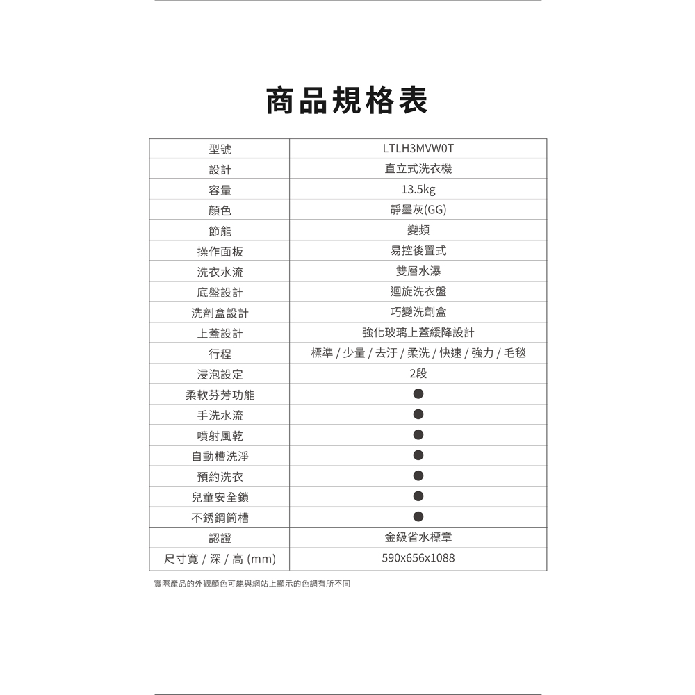商品特色:雙層水瀑搭載迴旋洗衣盤手洗水流滿足預洗需求噴射風乾減少晒衣時間全新節能省水行程浸泡及柔軟芳芬功能自動清潔內槽巧變洗劑盒洗劑輕鬆分配易控後置式面板及加大筒槽輕鬆拿取強化玻璃上蓋緩降設計變頻馬達高效洗衣商品規格:型號:LTLH3MVW0TGG洗衣容量:13.5kg顏色:靜墨灰電壓:110V / 60Hz尺寸:590 * 656 * 1088 mm重量:38kg內槽材質:不銹鋼馬達型式:變頻馬達產地:泰國保固:全機1年、機板,運轉組3年、馬達,壓縮機5年BSMI:R31270貨源:公司貨本商品資訊由網路及官網收集彙整而成,僅供參考,如有更新或異動不另外通知,正確商品資訊及規格以實機為準。鑑賞期非試用期,產品一經拆箱、插電及使用皆會影響您退貨權利。廢四機回收資訊:如需回收廢四機請於下單時備註,如未於訂單備註,後續需另派工收回將酌收派工費用500~1200元(跨區費另計)新購公告指定規格之電視機、洗衣機、電冰箱或冷、暖氣機時,販賣業者應提供同項目、數量、時間及同送達地址之廢四機回收(搬、載運)無償服務。但不包含為搬運、拆卸而動用大型機具、工程或危險施工等。消費者本人簽名確認已被口頭告知或知悉上述權益。本站配合環保署廢四機回收服務,本公司廢四機回收專線:0800-550678,環保署資源回收專線0800-085717。