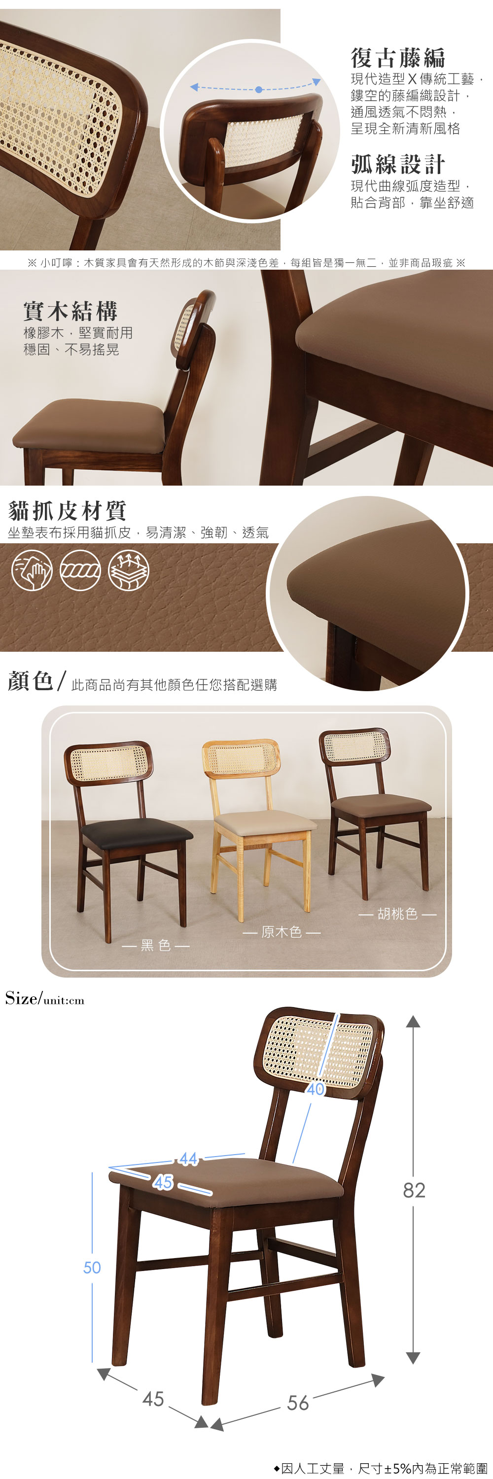 ◆實木材質結構,穩固耐用◆現代X傳統工藝,鏤空藤編風格◆貓抓皮坐墊,透氣、舒適好坐◆免自行組裝,專人配送到府整體配件:餐椅 x 2入尺寸:寬 45 x 深 56 x 高 82 公分材質:橡膠木、藤、貓抓皮坐墊顏色:胡桃色產地:中國誤差值:因人工丈量,尺寸±5%內為正常範圍