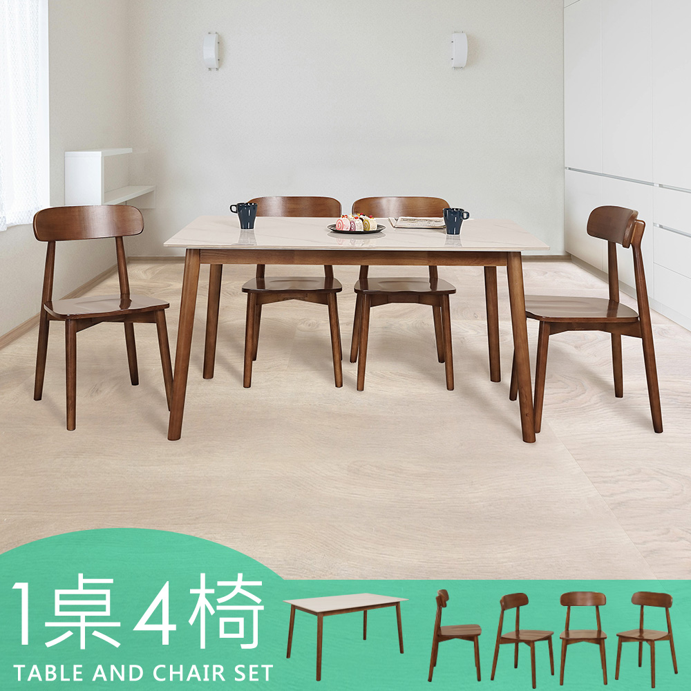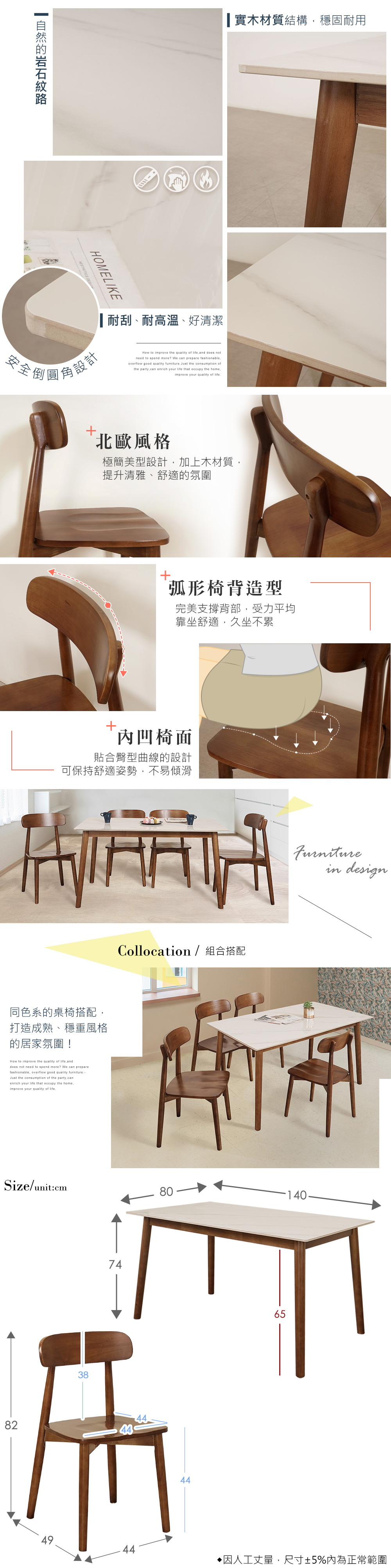 ◆岩板耐刮、耐高溫、好清潔◆實木材質結構,穩固耐用◆北歐風格設計,美型好搭◆一桌四椅,一次購齊◆免自行組裝,專人配送到府整體配件:餐桌 x 1 + 餐椅 x 4桌子尺寸:寬 140 x 深 80 x 高 74 公分椅子尺寸:寬 44 x 深 49 x 高 82 公分桌子材質:橡膠木、岩板椅子材質:橡膠木顏色:胡桃色產地:中國誤差值:因人工丈量,尺寸±5%內為正常範圍