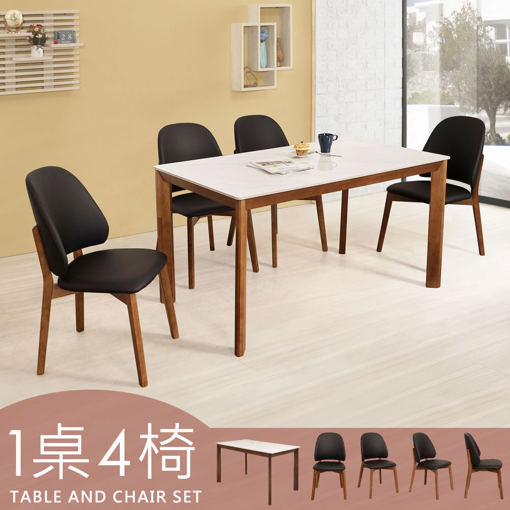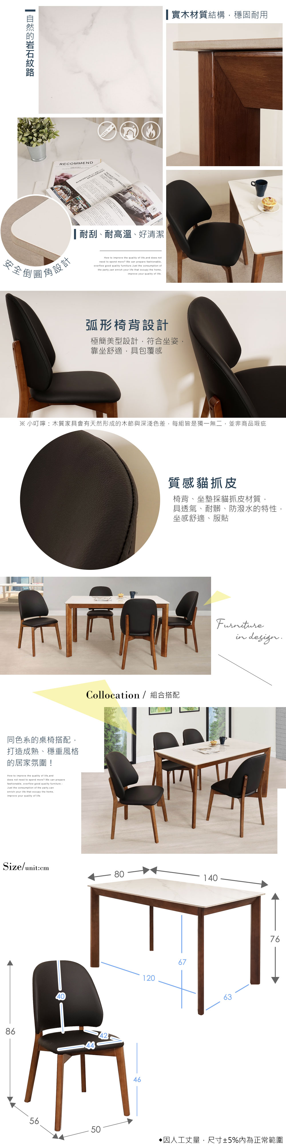 ◆岩板耐刮、耐高溫、好清潔◆實木材質結構,穩固耐用◆耐磨貓抓皮坐墊,舒適好坐◆弧形包覆椅背設計,靠坐好舒適◆免自行組裝,專人配送到府整體配件:餐桌 x 1 + 餐椅 x 4桌子尺寸:寬 140 x 深 80 x 高 76 公分椅子尺寸:寬 50 x 深 56 x 高86 公分桌子材質:橡膠木、岩板椅子材質:橡膠木、貓抓皮顏色:胡桃色產地:中國誤差值:因人工丈量,尺寸±5%內為正常範圍