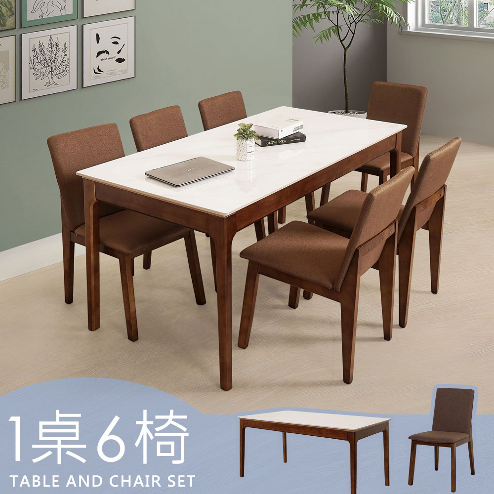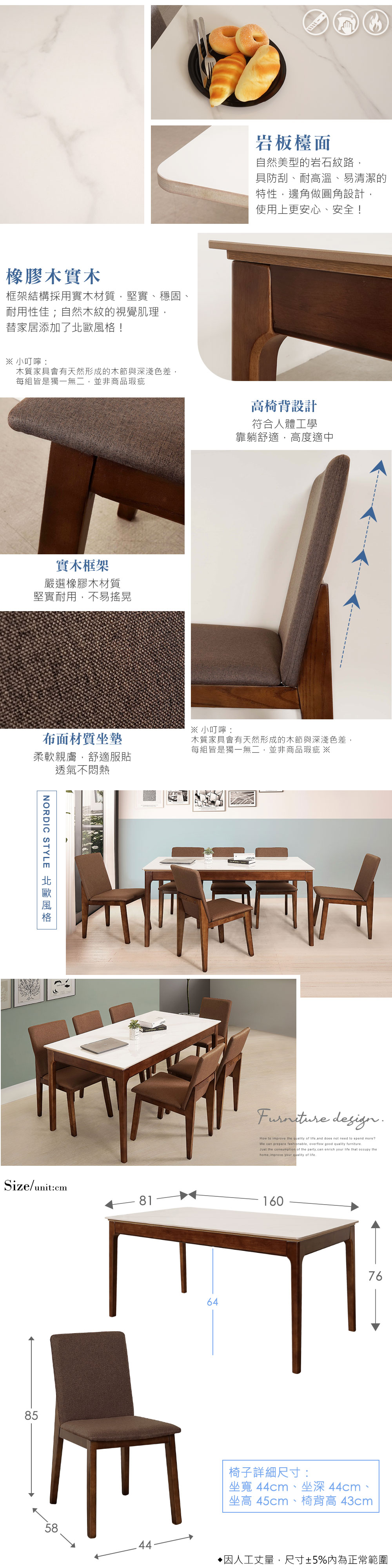 ◆大尺寸160cm的美型岩板檯面◆耐刮、耐高溫、好清潔◆實木材質結構,穩固耐用◆質感布面坐墊,舒適好坐◆免自行組裝,專人配送到府整體配件:餐桌 x 1 + 餐椅 x 6餐桌尺寸:寬 160 x 深 81 x 高 76 公分餐椅尺寸:寬 44 x 深 58 x 高 85 公分餐桌材質:橡膠木、岩板、MDF餐椅材質:橡膠木、布面顏色:胡桃色產地:中國誤差值:因人工丈量,尺寸±5%內為正常範圍