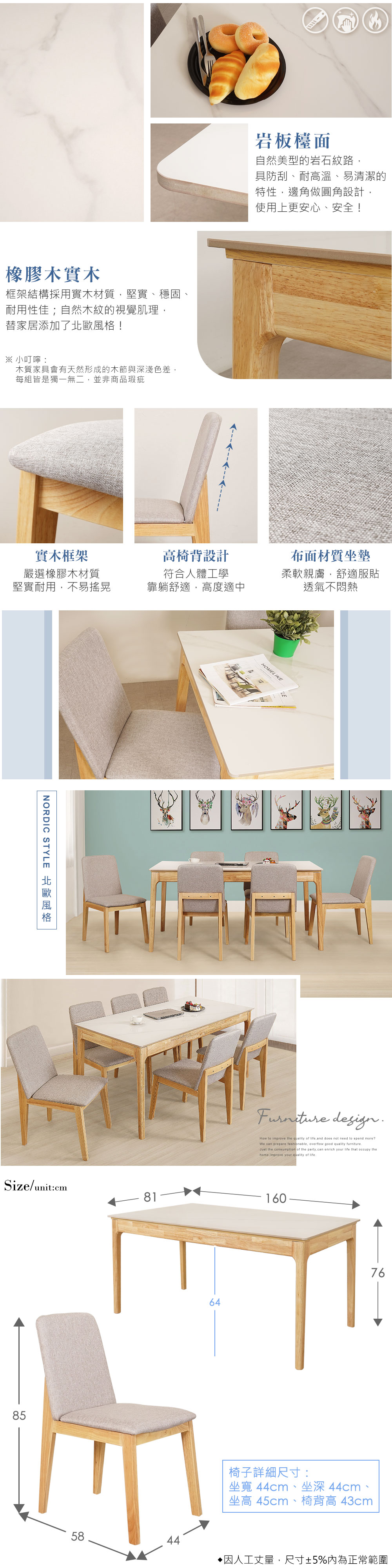 ◆大尺寸160cm的美型岩板檯面◆耐刮、耐高溫、好清潔◆實木材質結構,穩固耐用◆質感布面坐墊,舒適好坐◆免自行組裝,專人配送到府整體配件:餐桌 x 1 + 餐椅 x 6餐桌尺寸:寬 160 x 深 81 x 高 76 公分餐椅尺寸:寬 44 x 深 58 x 高 85 公分餐桌材質:橡膠木、岩板、MDF餐椅材質:橡膠木、布面顏色:原木色產地:中國誤差值:因人工丈量,尺寸±5%內為正常範圍