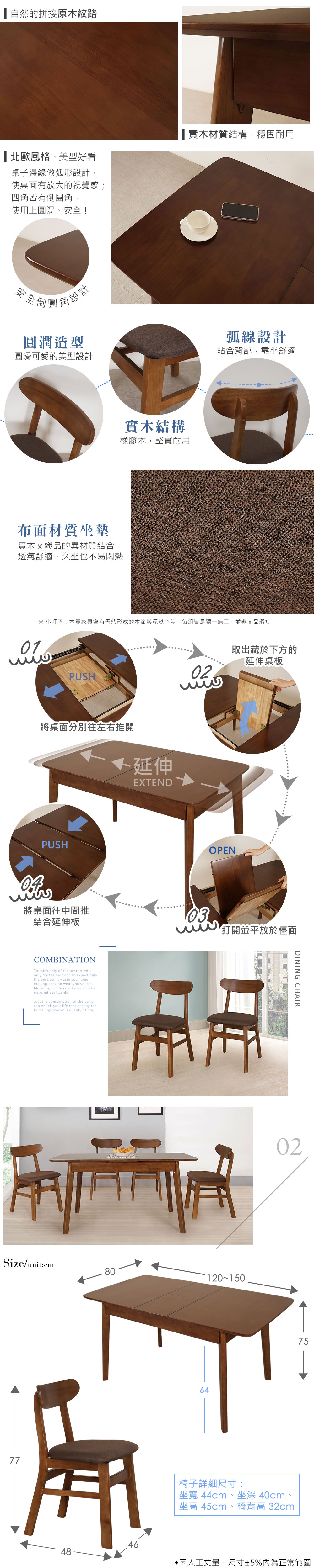 整體配件:餐桌 x 1 + 餐椅 x 4桌子尺寸:寬 120~150 x 深 80 x 高 75 公分椅子尺寸:寬 46 x 深 48 x 高 77 公分桌子材質:橡膠木椅子材質:橡膠木、布面顏色:胡桃色產地:中國誤差值:因人工丈量,尺寸±5%內為正常範圍