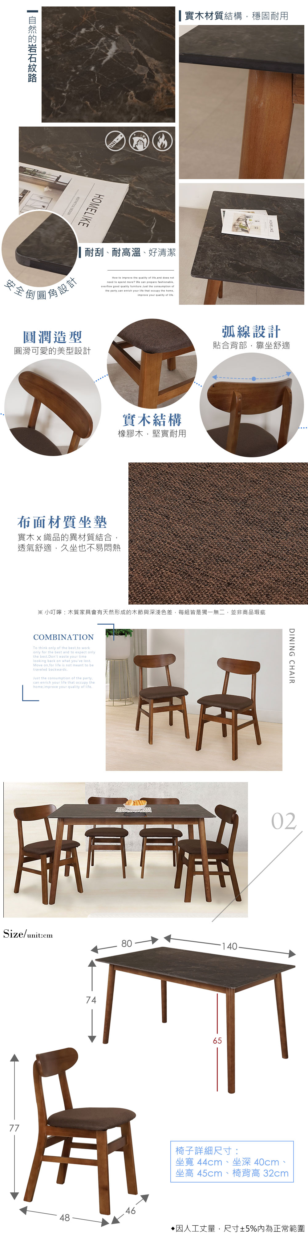 ◆岩板耐刮、耐高溫、好清潔◆實木材質結構,穩固耐用◆北歐風格設計,美型好搭◆一桌四椅,一次購齊◆免自行組裝,專人配送到府整體配件:餐桌 x 1 + 餐椅 x 4桌子尺寸:寬 140 x 深 80 x 高 74 公分餐椅尺寸:寬 46 x 深 48 x 高 77 公分桌子材質:橡膠木、岩板椅子材質:橡膠木、布面顏色:胡桃色產地:中國誤差值:因人工丈量,尺寸±5%內為正常範圍