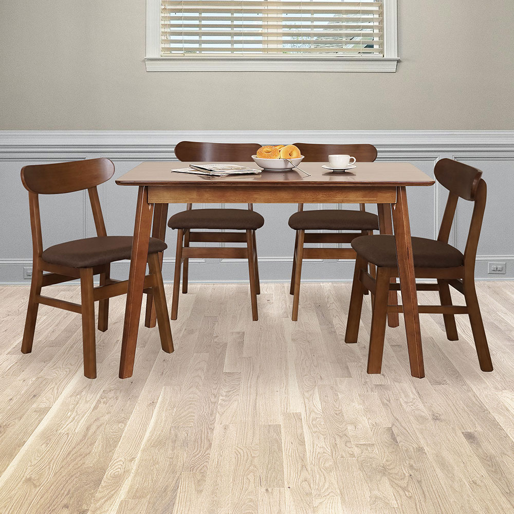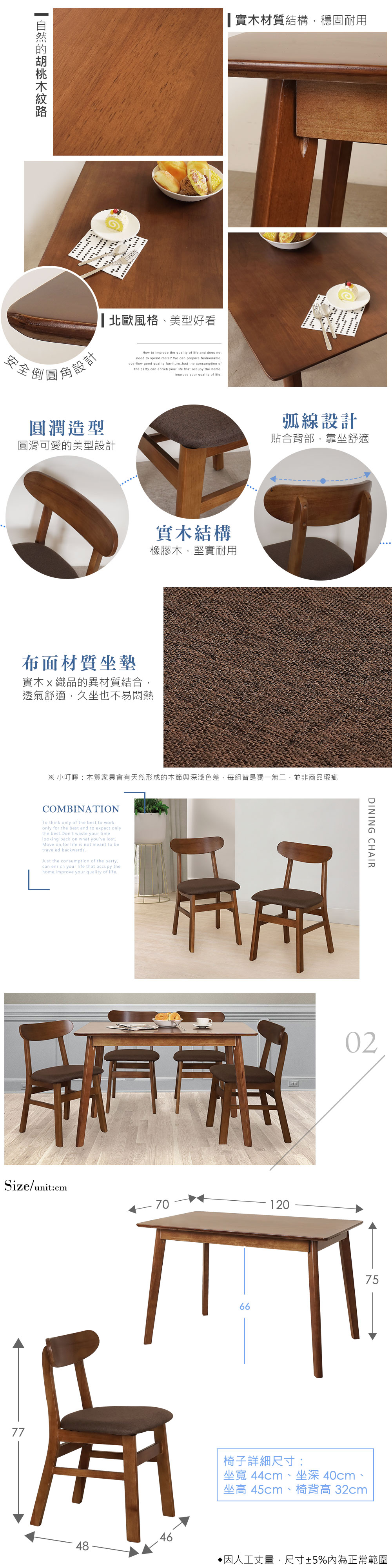 ◆實木材質結構,穩固耐用◆北歐風簡約餐桌椅,美型好搭◆經典、沉穩的胡桃木紋肌理◆免自行組裝,專人配送到府整體配件:餐桌 x 1 + 餐椅 x 4餐桌尺寸:寬 120 x 深 70 x 高 75 公分餐椅尺寸:寬 46 x 深 48 x 高 77 公分材質:橡膠木顏色:胡桃色產地:中國誤差值:因人工丈量,尺寸±5%內為正常範圍