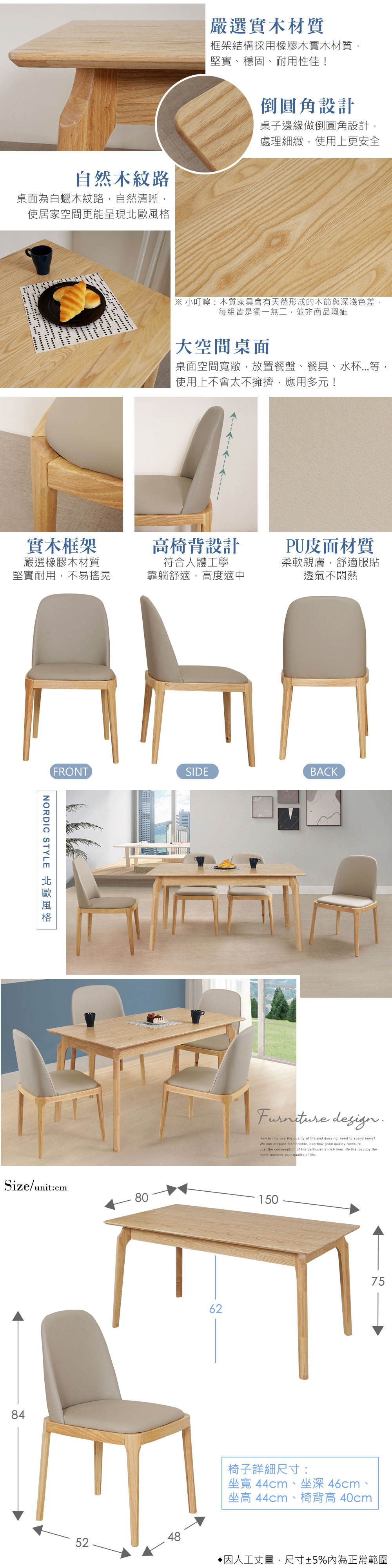 ◆實木材質結構,穩固耐用◆北歐風格餐桌,美型好搭◆清新、自然的木紋肌理◆質感PU皮坐墊,舒適好坐◆柔軟親膚的皮質椅背設計◆一桌四椅,一次購齊◆免自行組裝,專人配送到府整體配件:餐桌 x 1 + 餐椅 x 4桌子尺寸:寬 150 x 深 80 x 高 75 公分椅子尺寸:寬 48 x 深 52 x 高 84 公分桌子材質:橡膠木、白蠟木紋桌面椅子材質:橡膠木、PU皮面顏色:原木色產地:中國誤差值:因人工丈量,尺寸±5%內為正常範圍