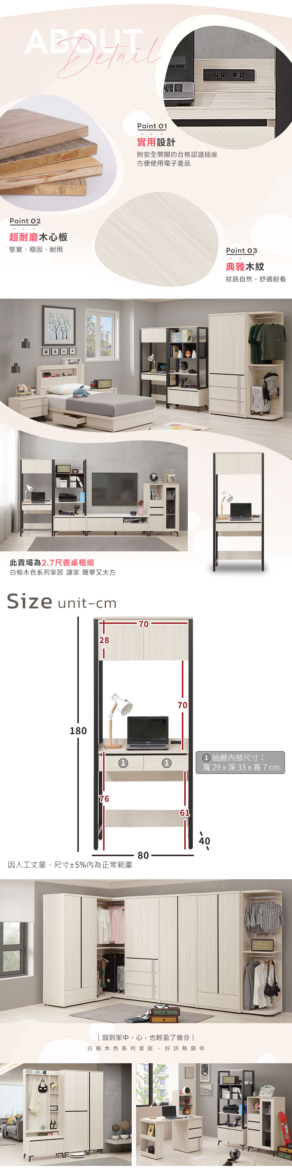 ◆白榆現代、英倫風格◆附插座,方便3C、電器使用◆工業風格鐵框設計◆免自行組裝,專人配送到府尺寸:寬 80 x 深 40 x 高 180 公分材質:高級木心板+鐵架顏色:白榆木色產地:台灣誤差值: 因人工丈量,尺寸±5%內為正常範圍