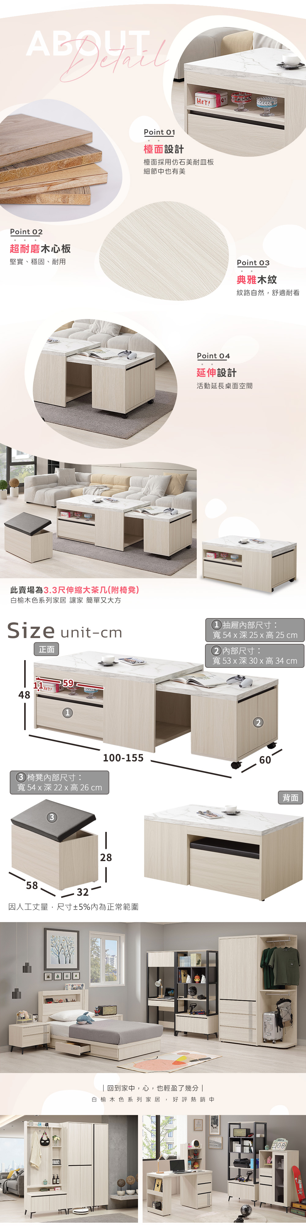 ◆白榆現代、英倫風格◆活動延長桌面空間◆一大抽方便收納◆內附收納椅凳◆免自行組裝,專人配送到府尺寸:寬 100~155 x 深 60 x 高 48 公分材質:高級木心板+仿石美耐皿板顏色:白榆木色產地:台灣誤差值: 因人工丈量,尺寸±5%內為正常範圍