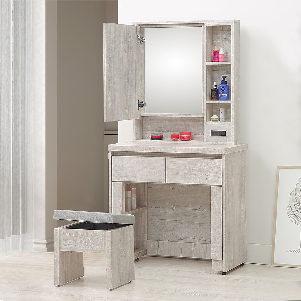 ◆木心板材質,堅實、穩固、耐用◆清新淺色系,質感木紋路視覺◆隱藏式掀門化妝鏡設計,便利性佳◆抽屜+置物格空間,收納多元、好分類◆附插座,方便使用美容電器,好實用◆免組裝,由專人宅配到府尺寸:寬 80 x 深 40 x 高 157 公分材質:高級木心板顏色:白榆木色產地:台灣誤差值:因人工丈量,尺寸±5%內為正常範圍
