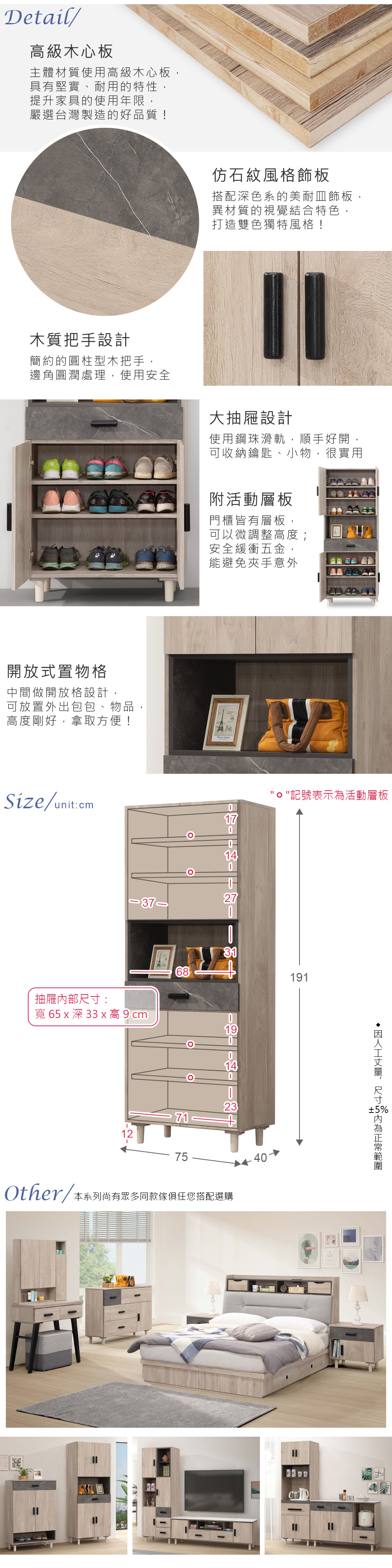 ◆門櫃使用安全緩衝五金◆附活動層板,使用更方便◆多層、大容量的空間設計◆免組裝,專人配送到府◆個性獨特的淺灰橡雙色系◆七層收納空間+一抽屜置物尺寸:寬 75 x 深 40 x 高 191 公分材質:高級木心板顏色:淺灰橡雙色產地:台灣誤差值:因人工丈量,尺寸±5%內為正常範圍